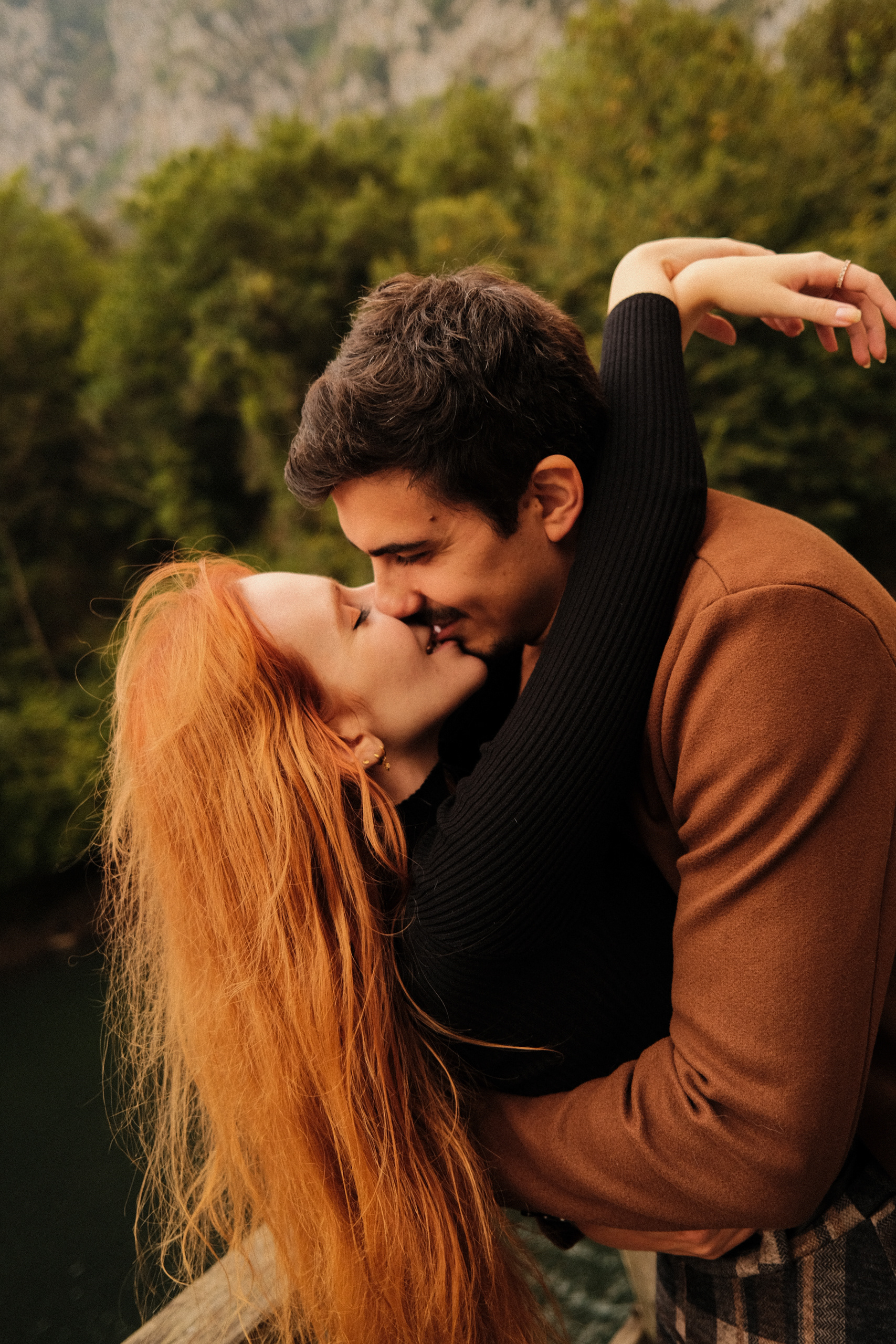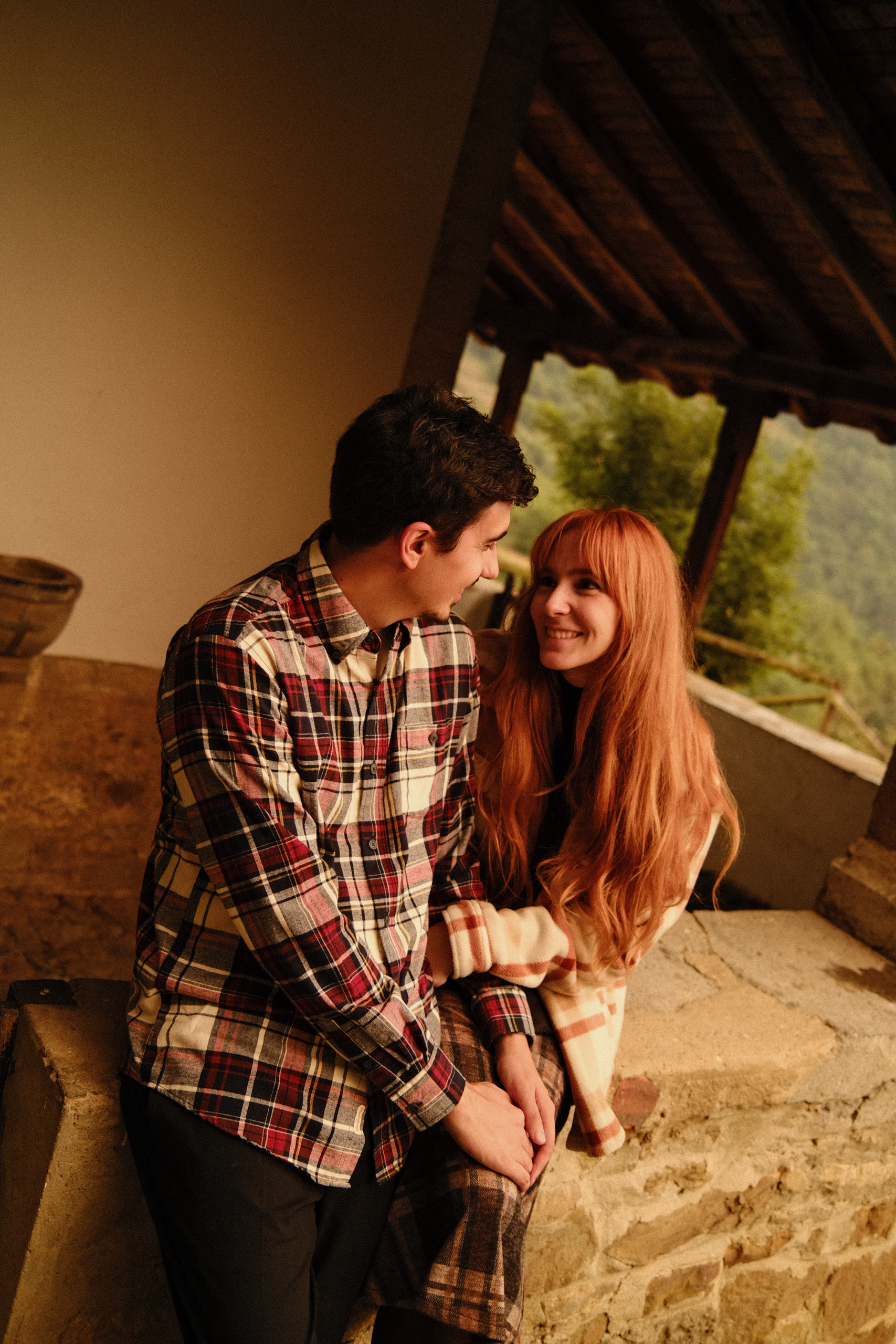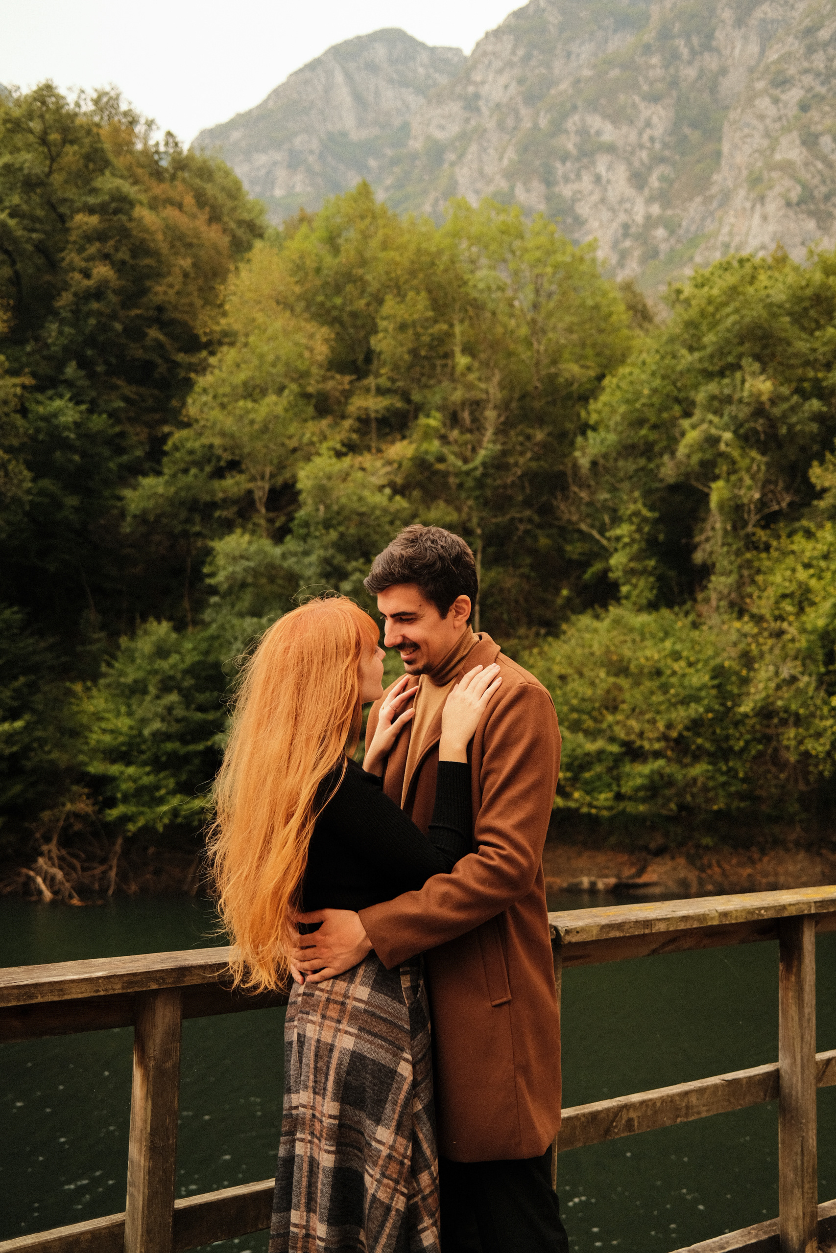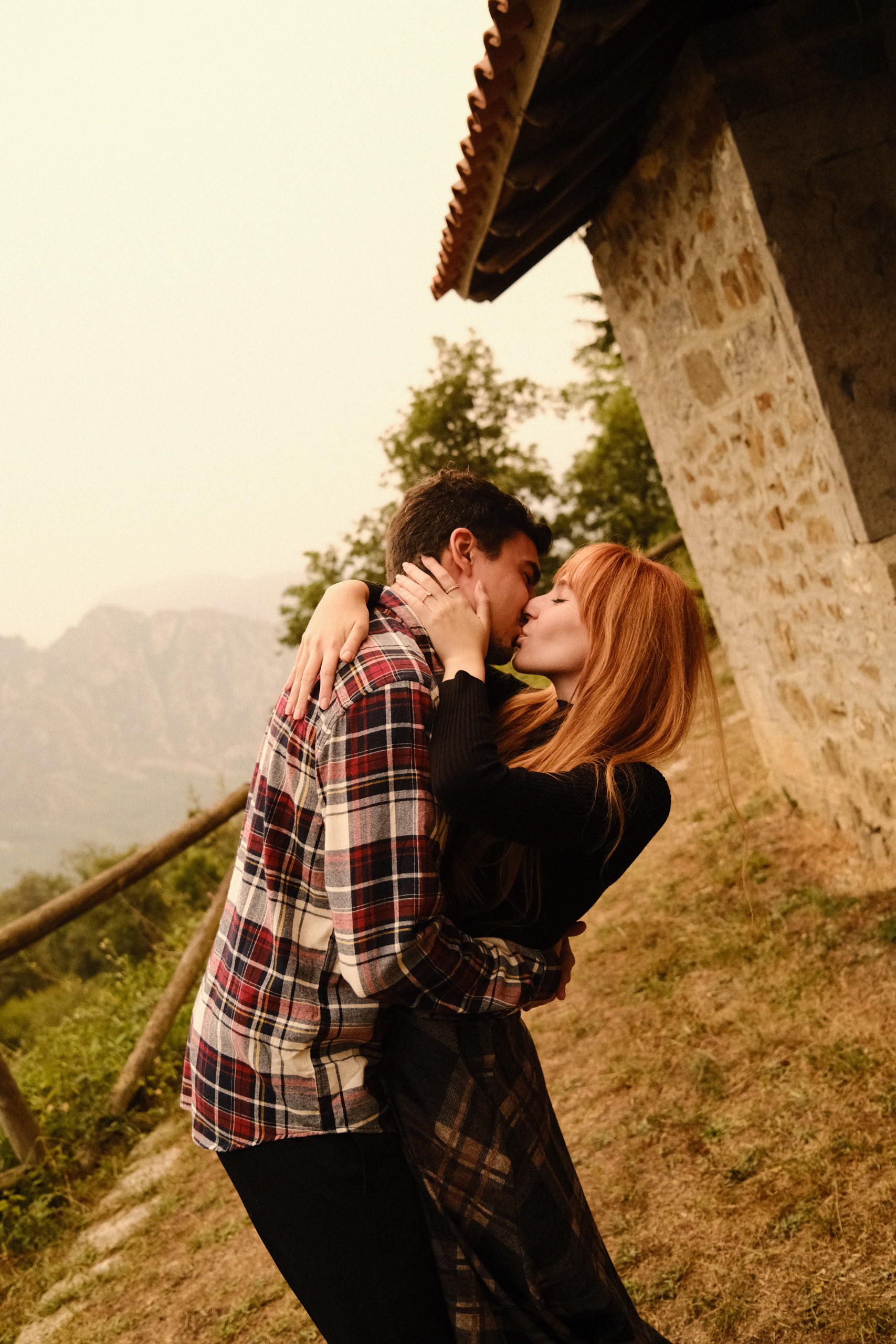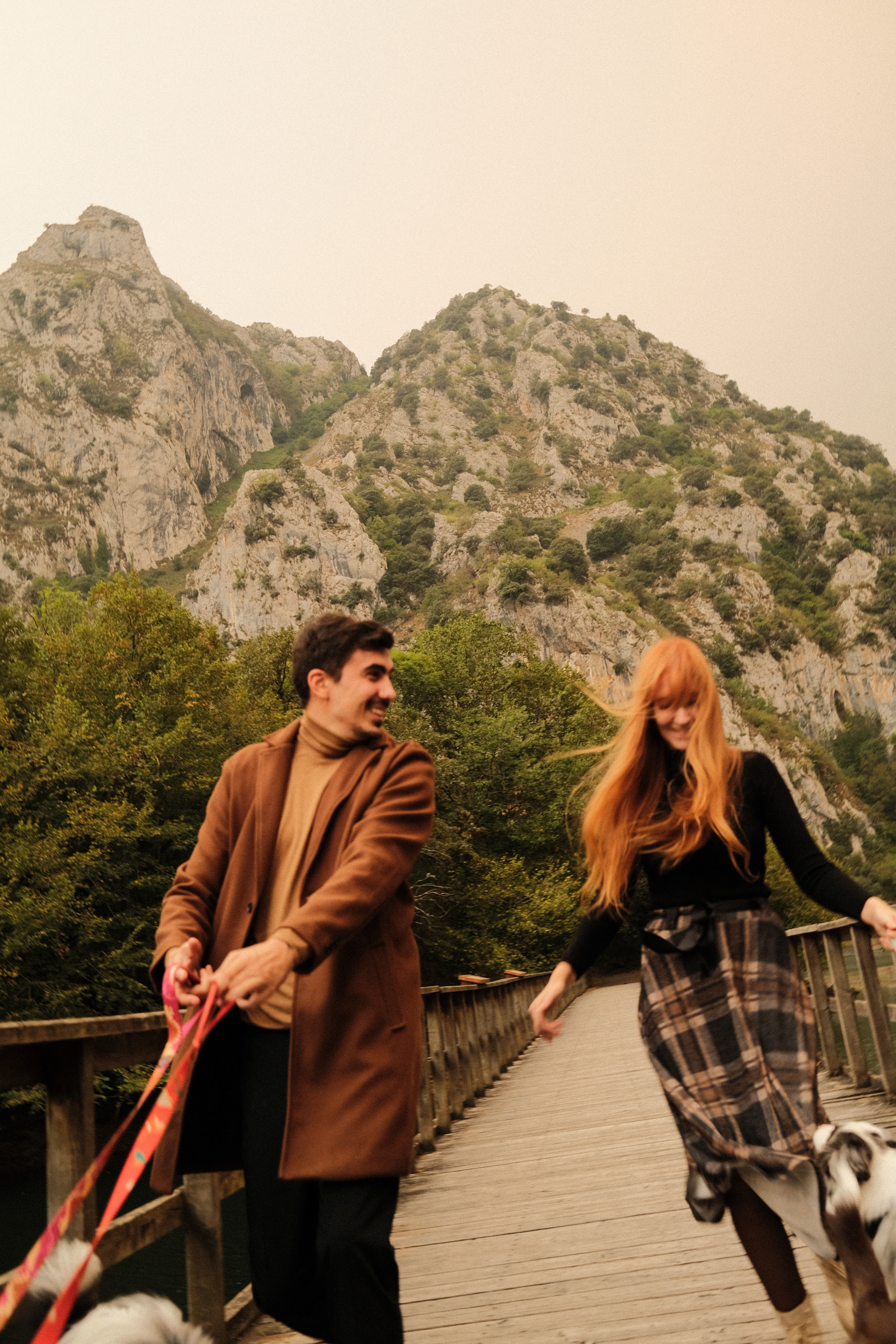 Con todos ellos pusimos rumbo a uno de nuestros spots favoritos, el Embalse de Valdemurio, justo al comienzo del Parque Natural de Las Ubiñas, en Asturias, a escasa media hora de Oviedo. El cielo algo naranja a causa de los incendios cercanos que ocurrían en esos días aportaba una atmósfera muy moody al atardecer, anaranjada, casi otoñal, algo que por suerte nos daría el marco ideal junto a los outfits de la pareja. Comenzamos en el embarcadero donde siempre acompañan unas canoas de alquiler conociendo a sus amigos caninos, sentados, con besos y alguna chuche las fotografías de esta parte de la sesión resultarían en algo espectacular. Los detalles y las manos, los planos generales desde lejos, las primeras sonrisas nerviosas... Tras ello y ya más sueltos correríamos por la pasarela de madera que cruza de lado a lado el embalse, al fondo, las montañas del parque presidían imponentes la vista. Cambiando de escenario poco antes de terminar la sesión subiríamos hasta la zona del Tejo de Bermiego, un monumento natural en Quirós junto a la Iglesia de Santa María en el pueblo de mismo nombre, Bermiego, un bonito paseo previo a la boda de estos dos.