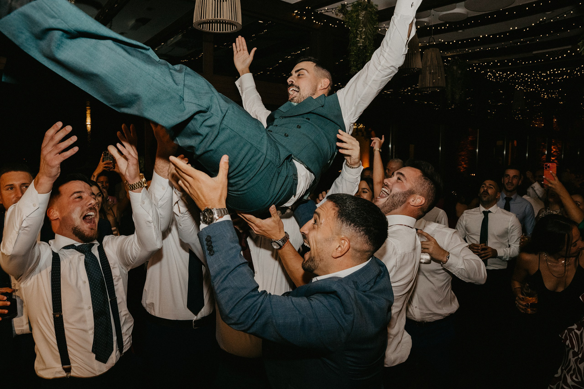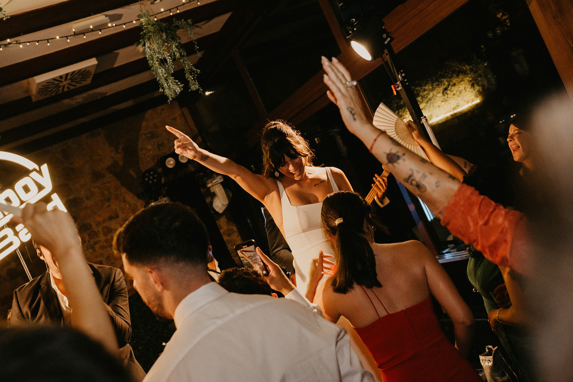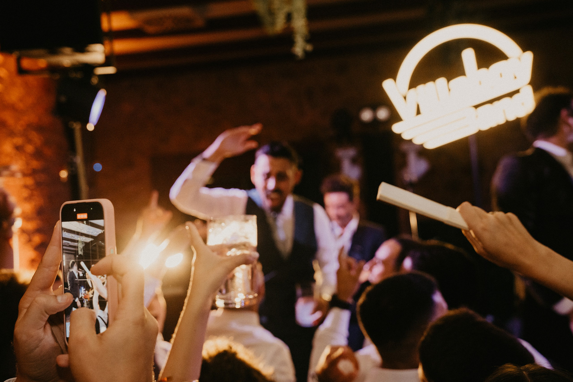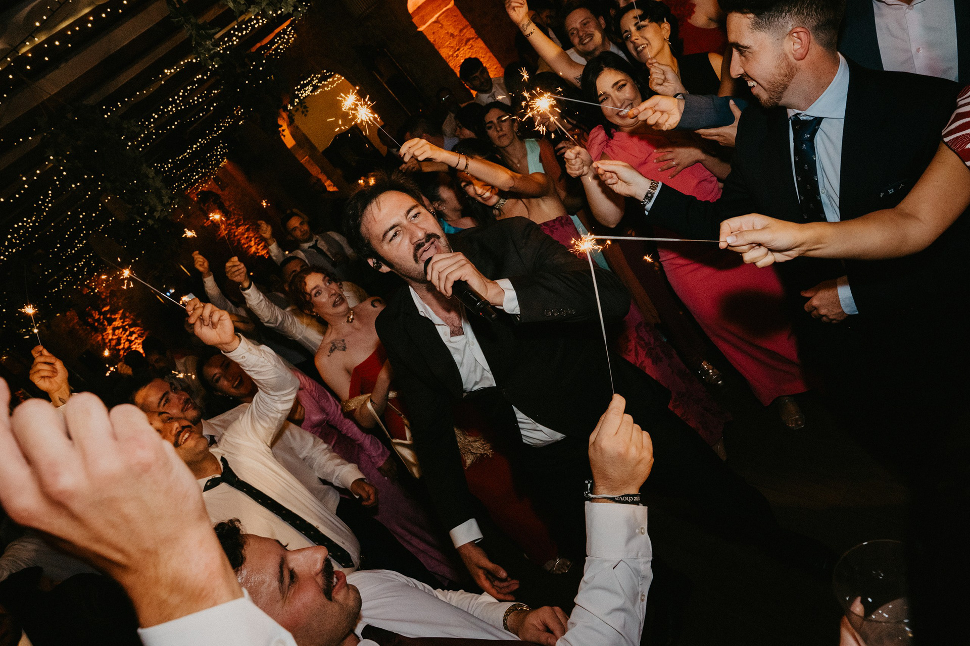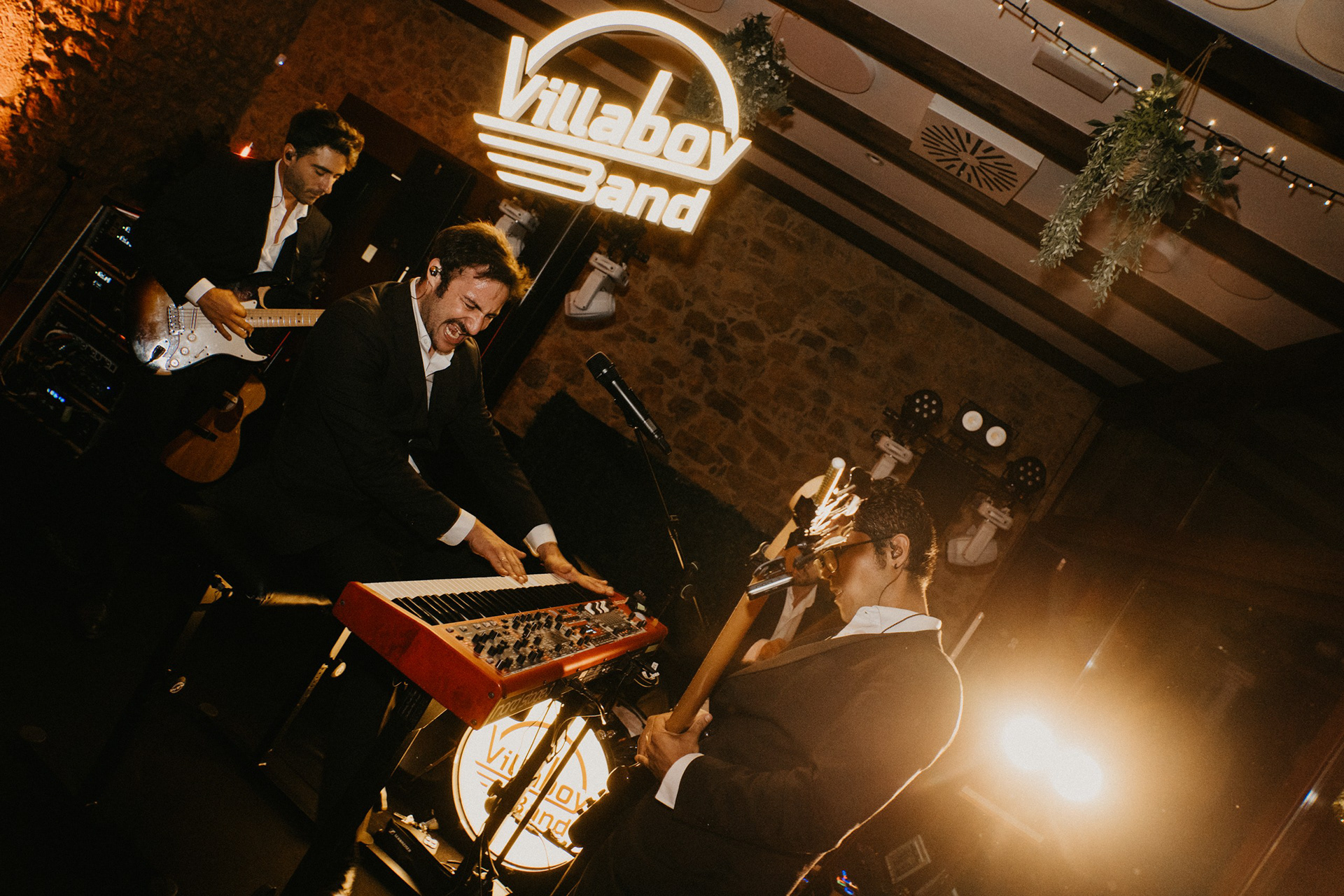 Tras la sesión fotográfica en los jardines con la pareja, degustamos el banquete, había que coger fuerzas para lo que venía a continuación. Guitarra, bajo, teclado, batería y voz empezaron a poner ritmo al baile nupcial, no era una playlist, tampoco una banda cualquiera. Los Villaboy Band tomaron el escenario del Palacio de Valdesoto con su show lleno de bengalas, momentos frenéticos y versiones del pock e indie español para hacernos saltar sin parar.