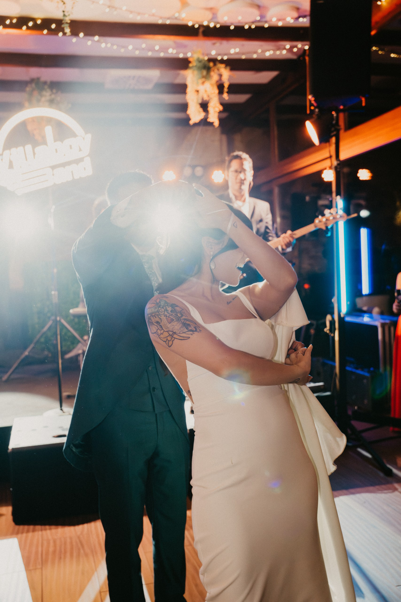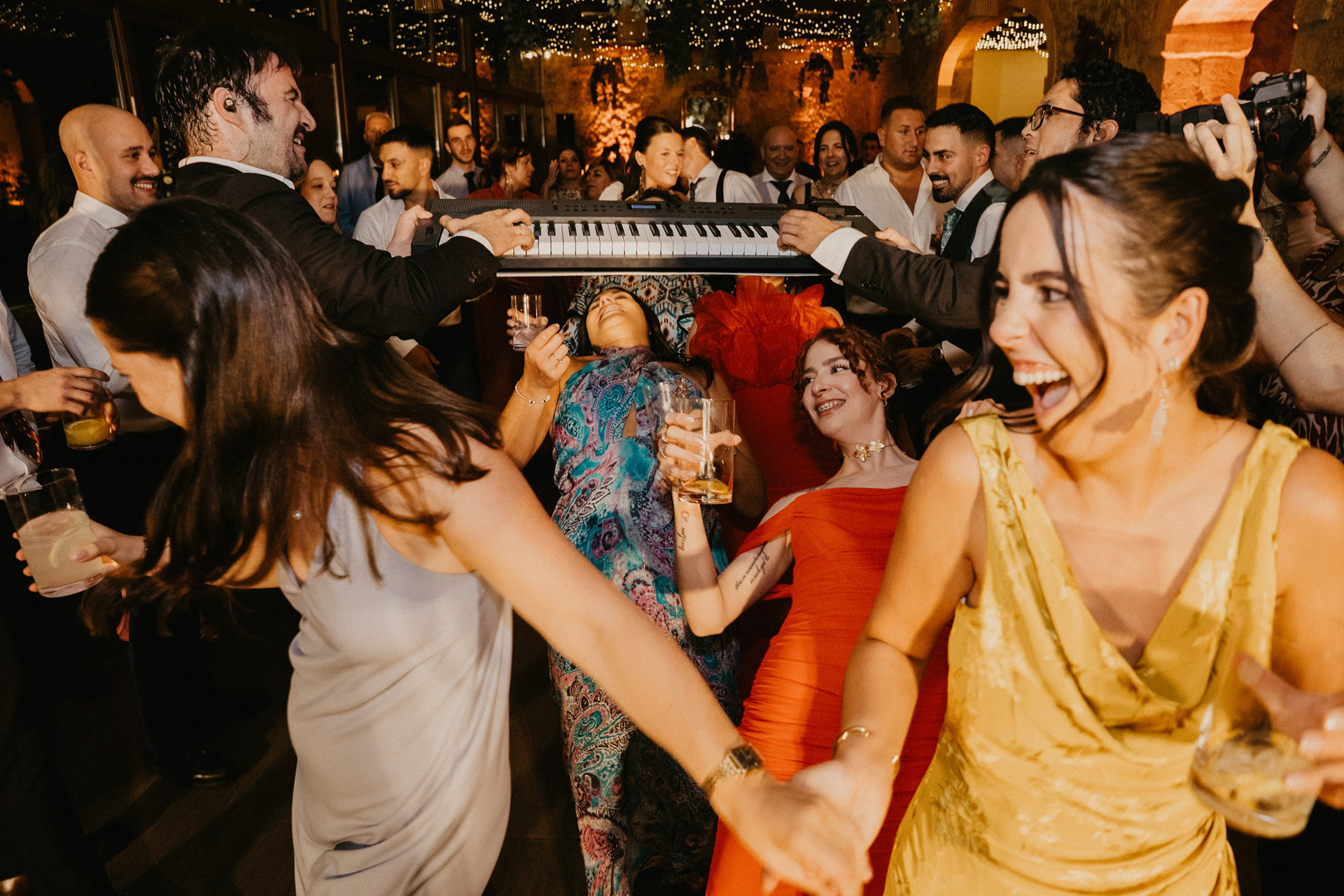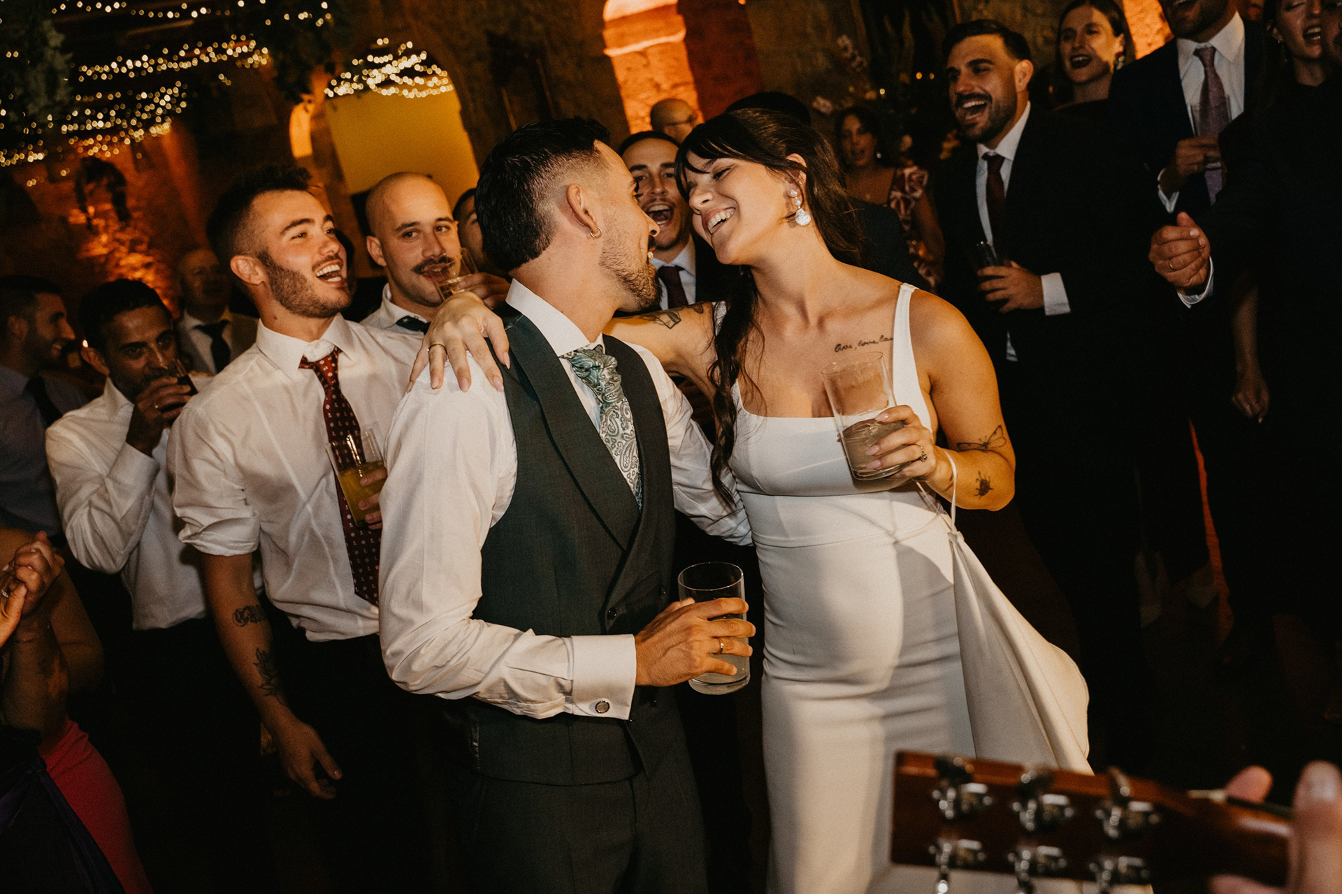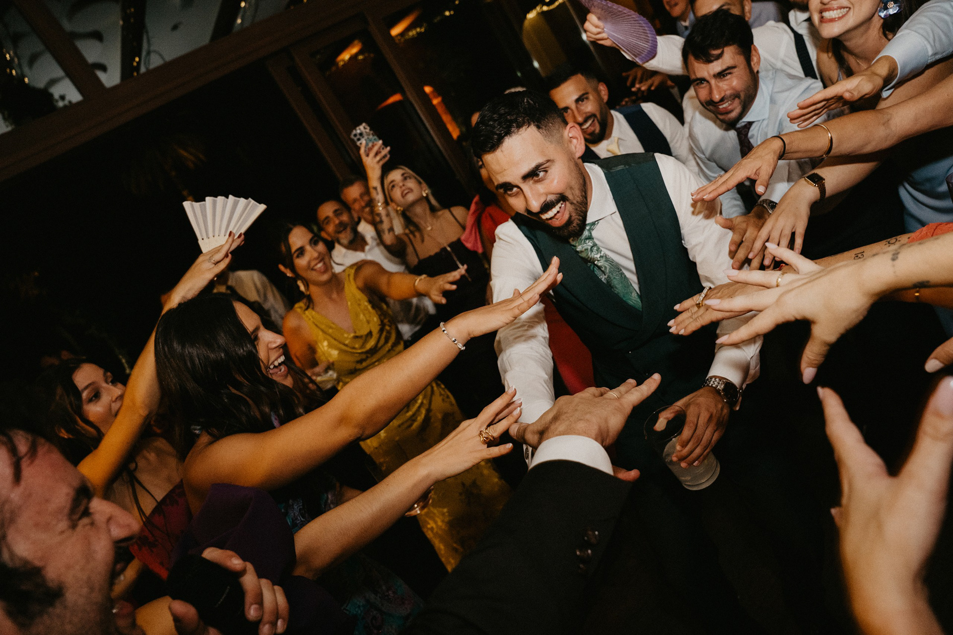 Tras la sesión fotográfica en los jardines con la pareja, degustamos el banquete, había que coger fuerzas para lo que venía a continuación. Guitarra, bajo, teclado, batería y voz empezaron a poner ritmo al baile nupcial, no era una playlist, tampoco una banda cualquiera. Los Villaboy Band tomaron el escenario del Palacio de Valdesoto con su show lleno de bengalas, momentos frenéticos y versiones del pock e indie español para hacernos saltar sin parar.