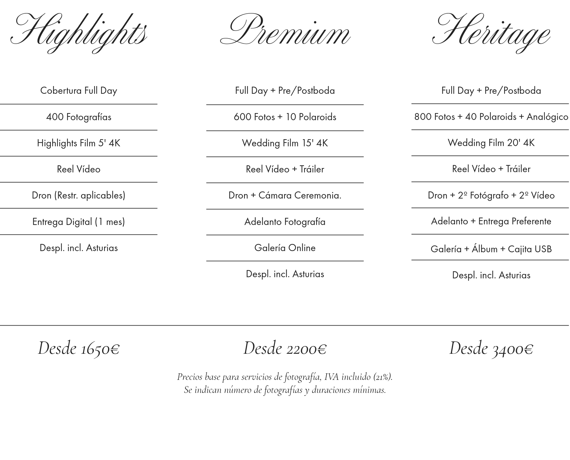 Ofrecemos tres packs de fotografía y/o vídeo de bodas, cada uno ha sido diseñado para satisfacer diversas necesidades como presupuestos.