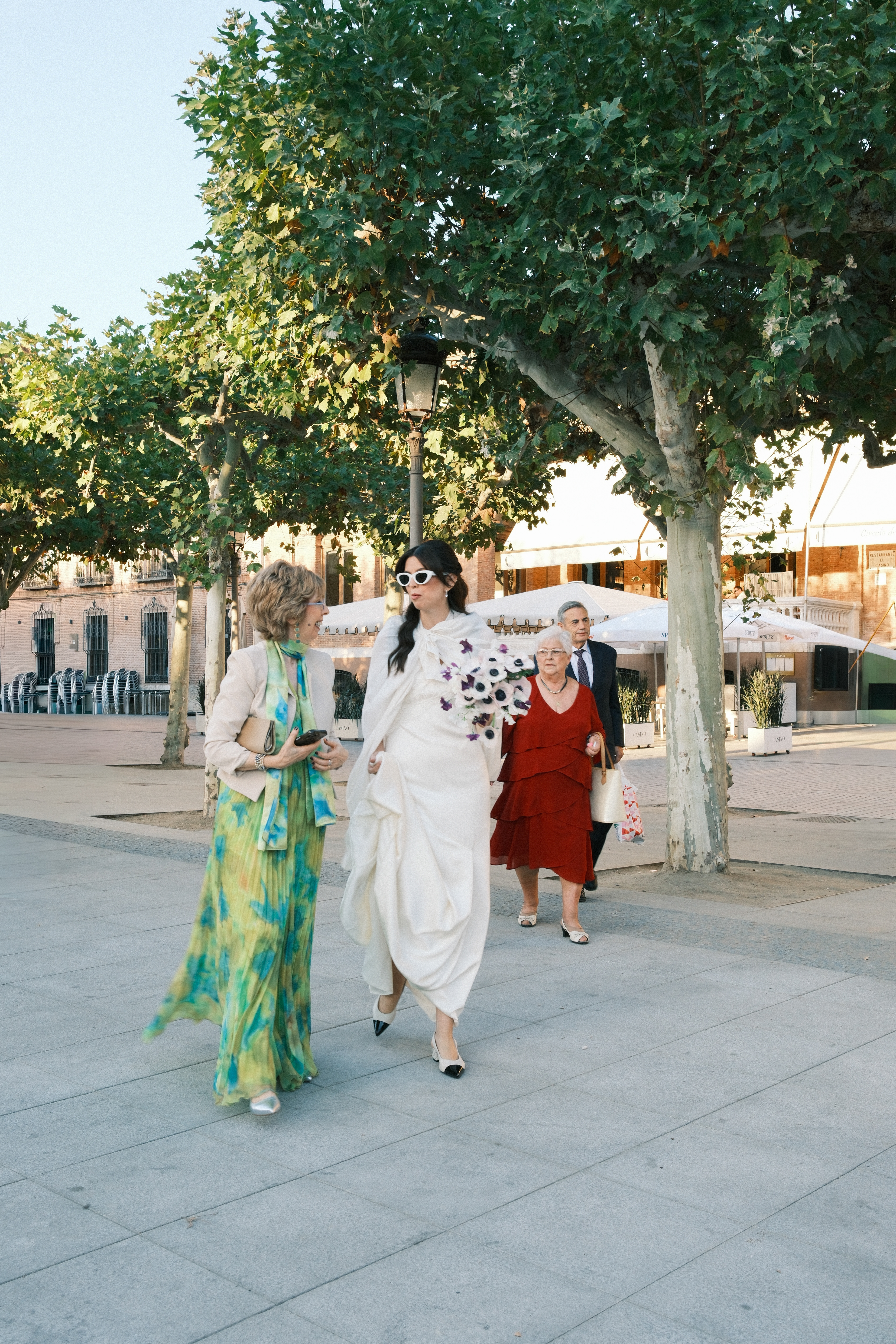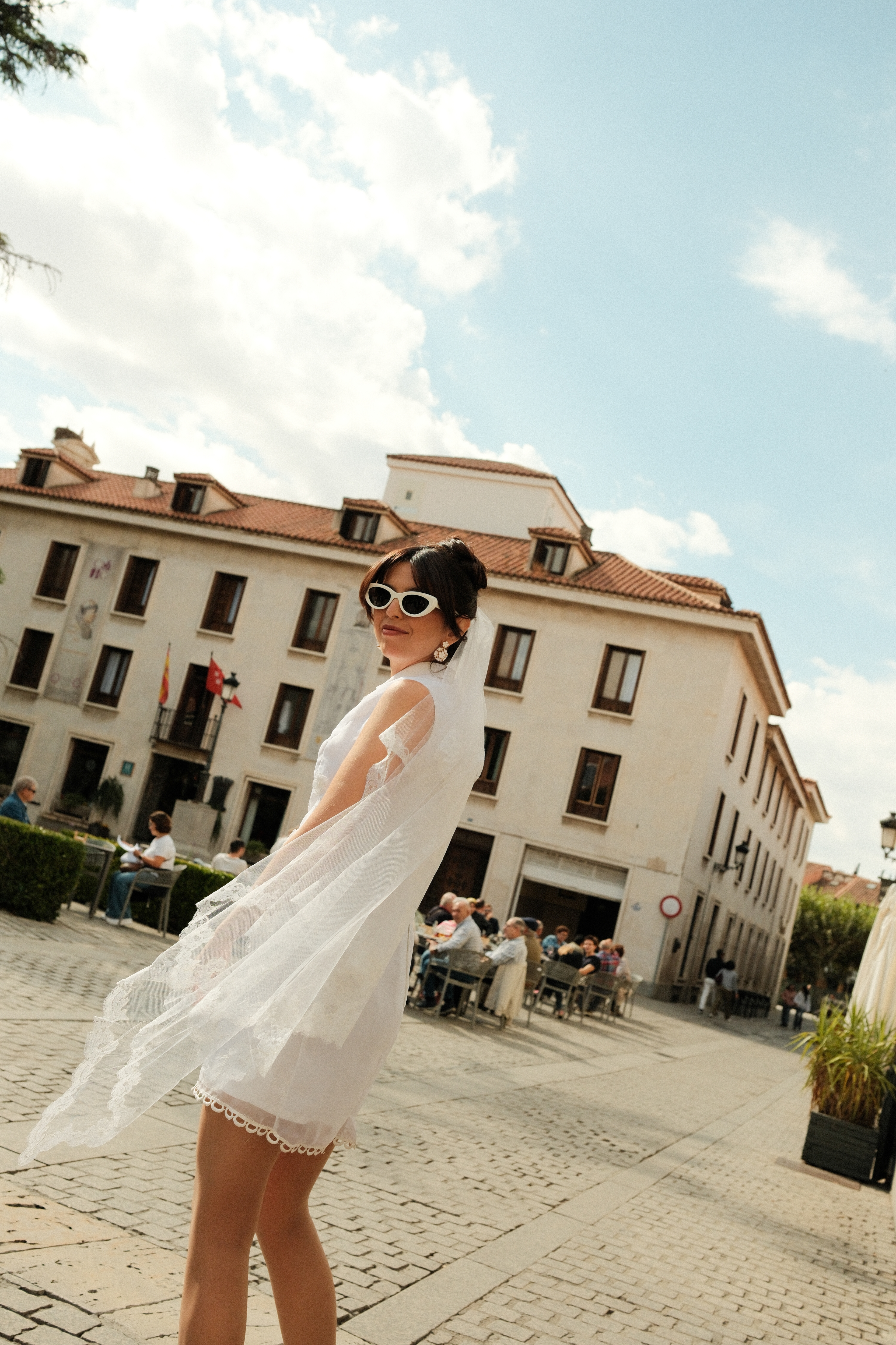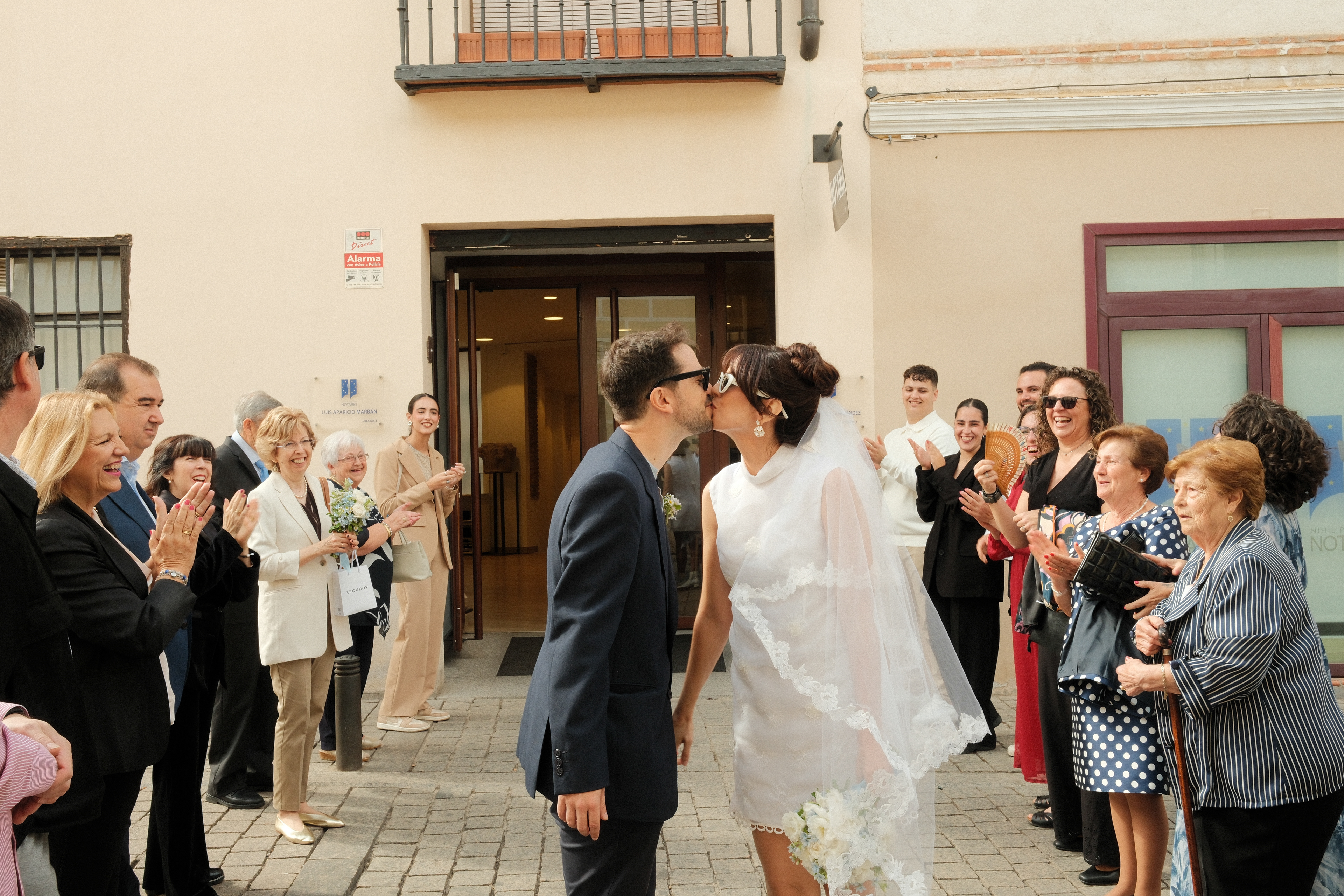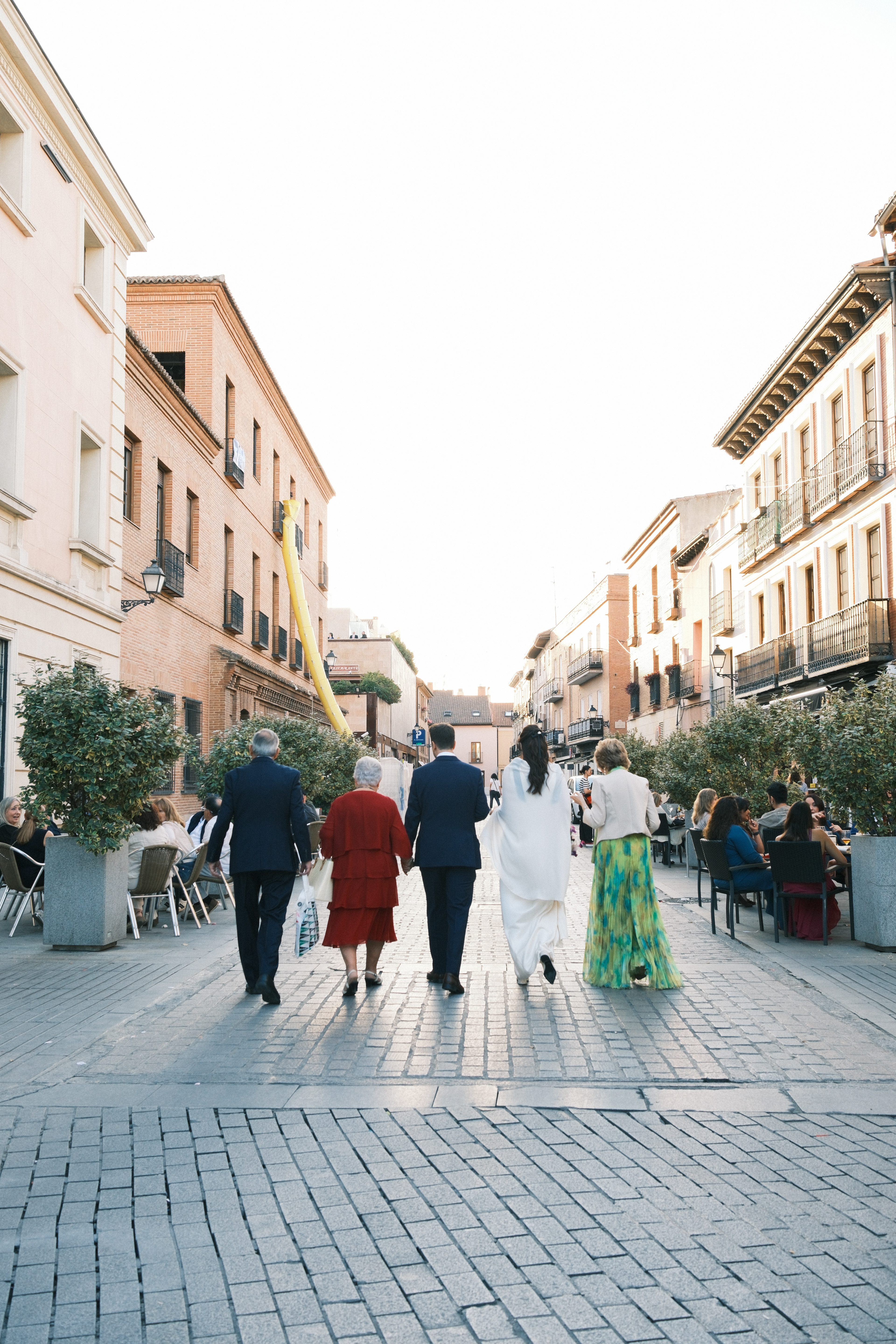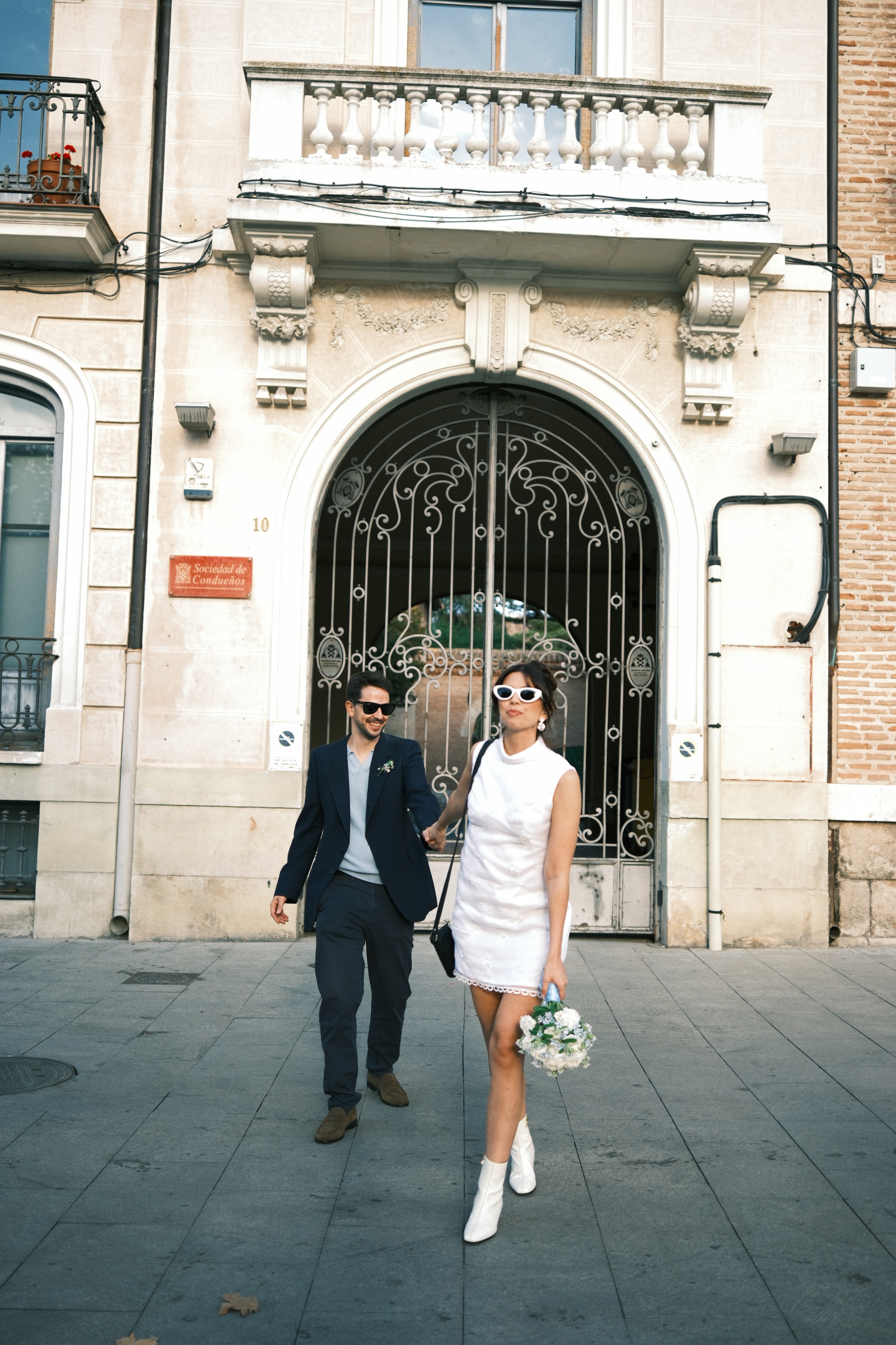 Odio los horarios y las limitaciones, los planes bonitos no deberían entender de horarios; en lo de Sil & Rubén tuvimos dos días para estar junto a ellos y disfrutar de Alcalá. A la primera mañana y tras un buen desayuno en Bartolo nos dirigimos a la notaría al lado de la Plaza de San Diego, Sil brillaba con el vestido de novia de su abuela en un trendy y original giro acompañado de gafas de sol, botas, y el ramo de Flores Mercuriales. Tras la firma recibimos a la pareja entre aplausos y nos fuimos todos juntos a tomar el vermú en una taberna cercana.