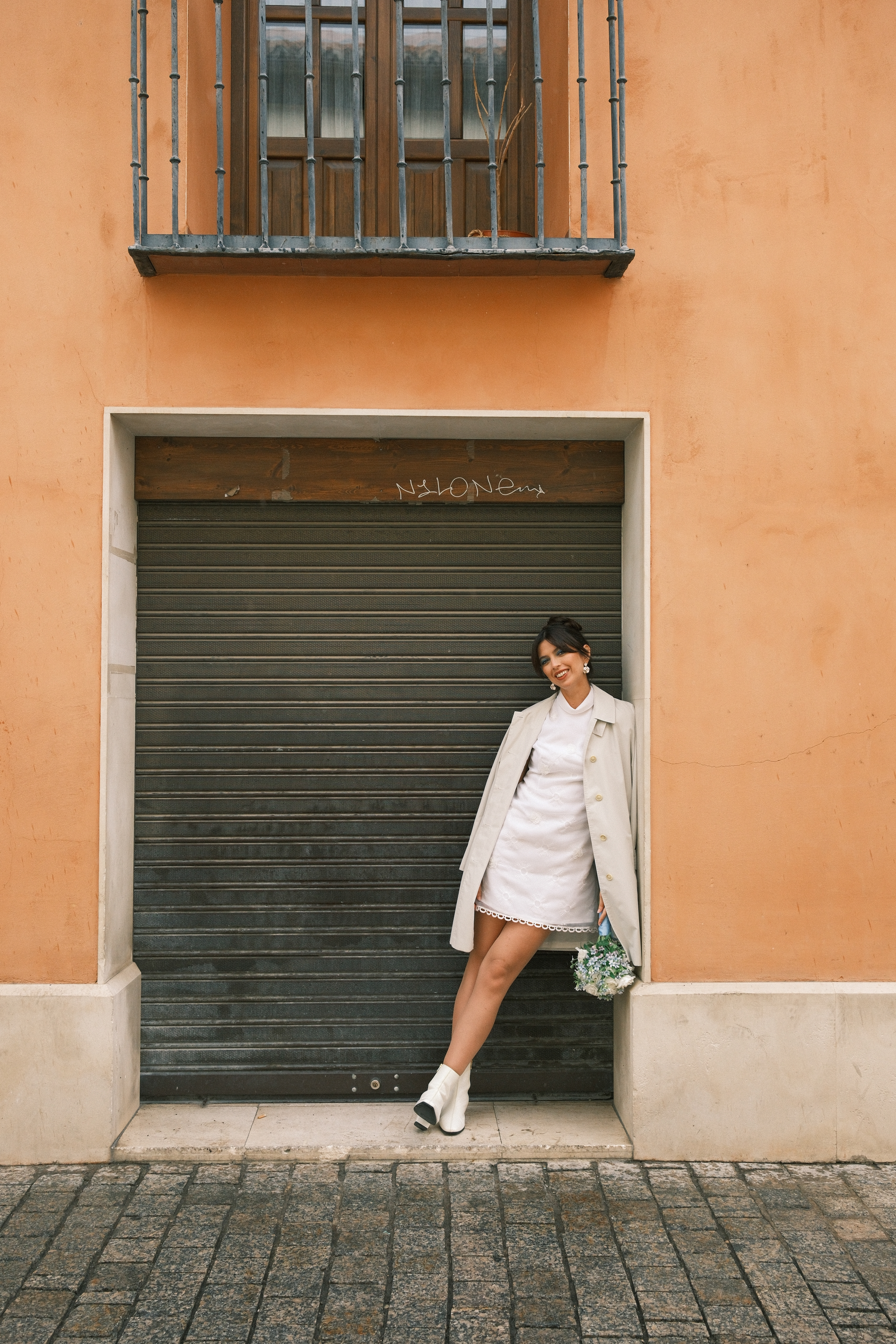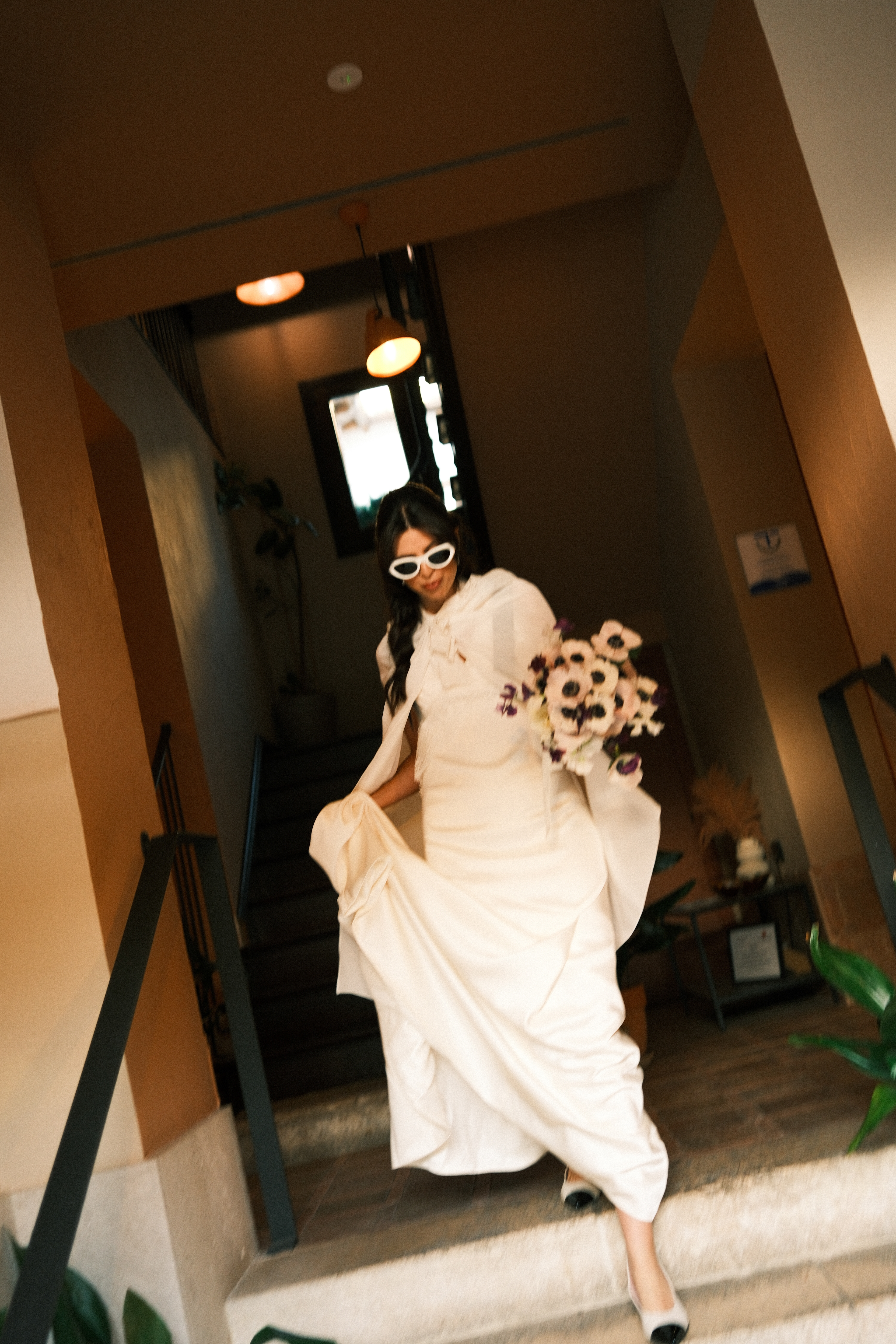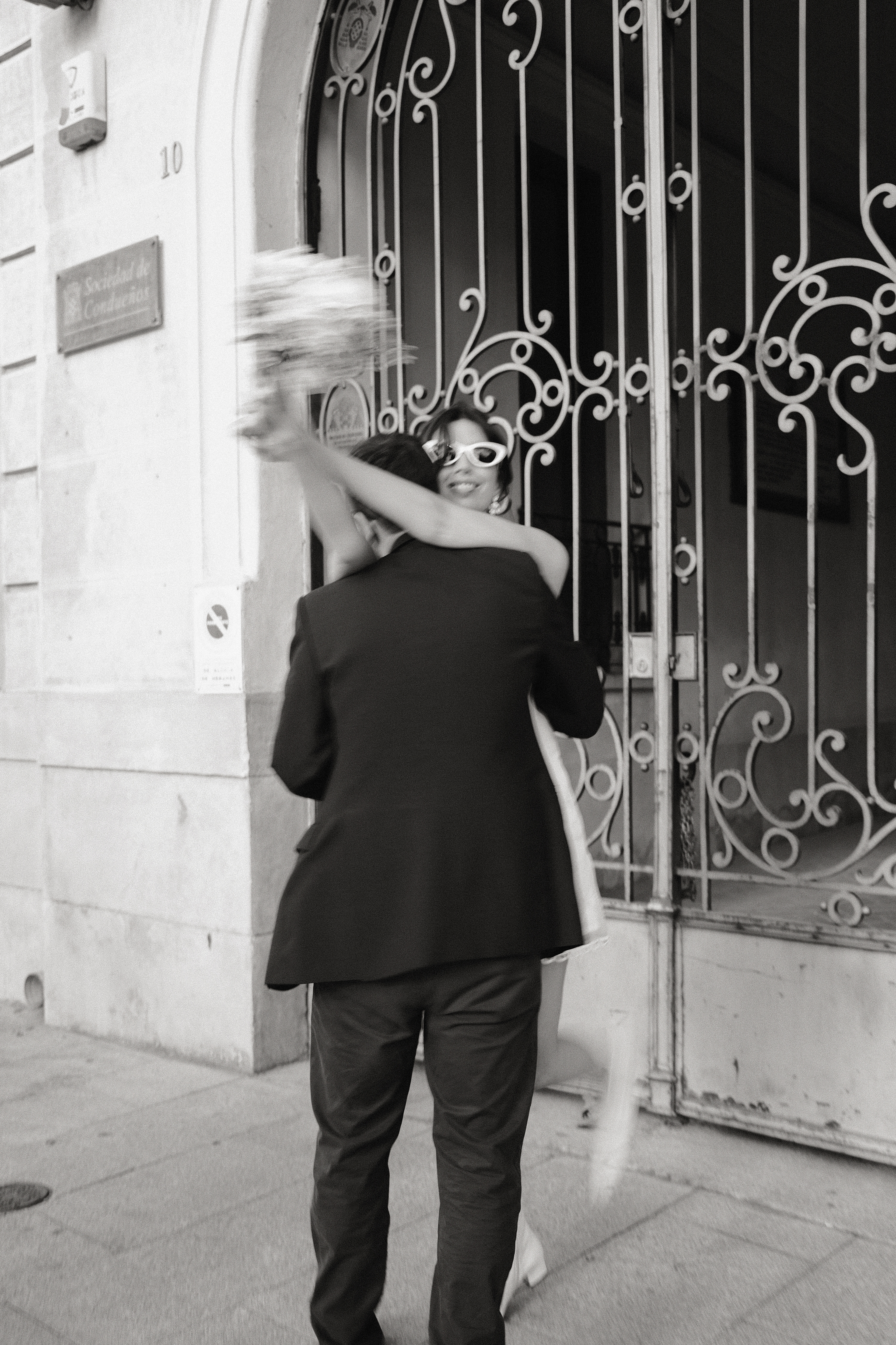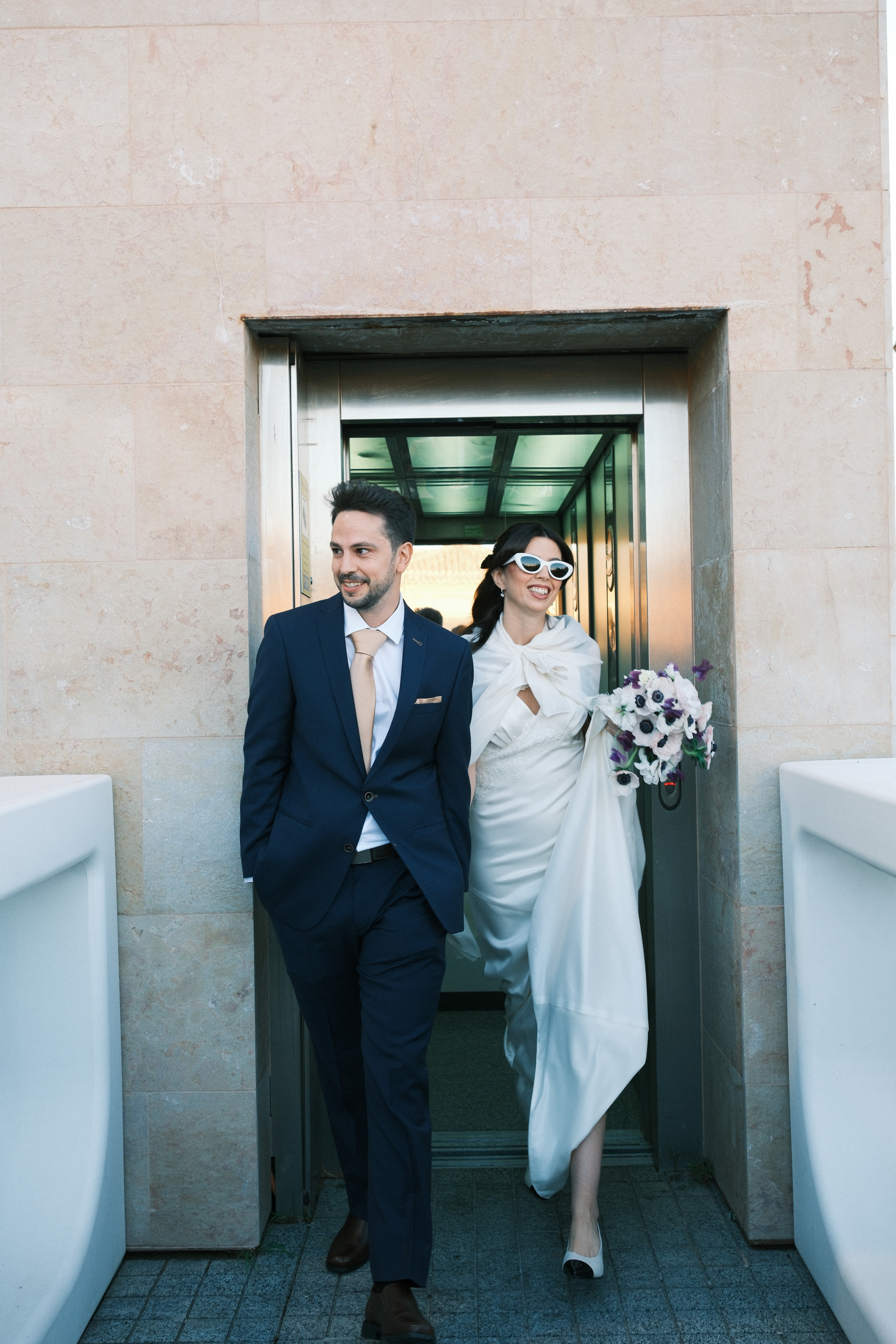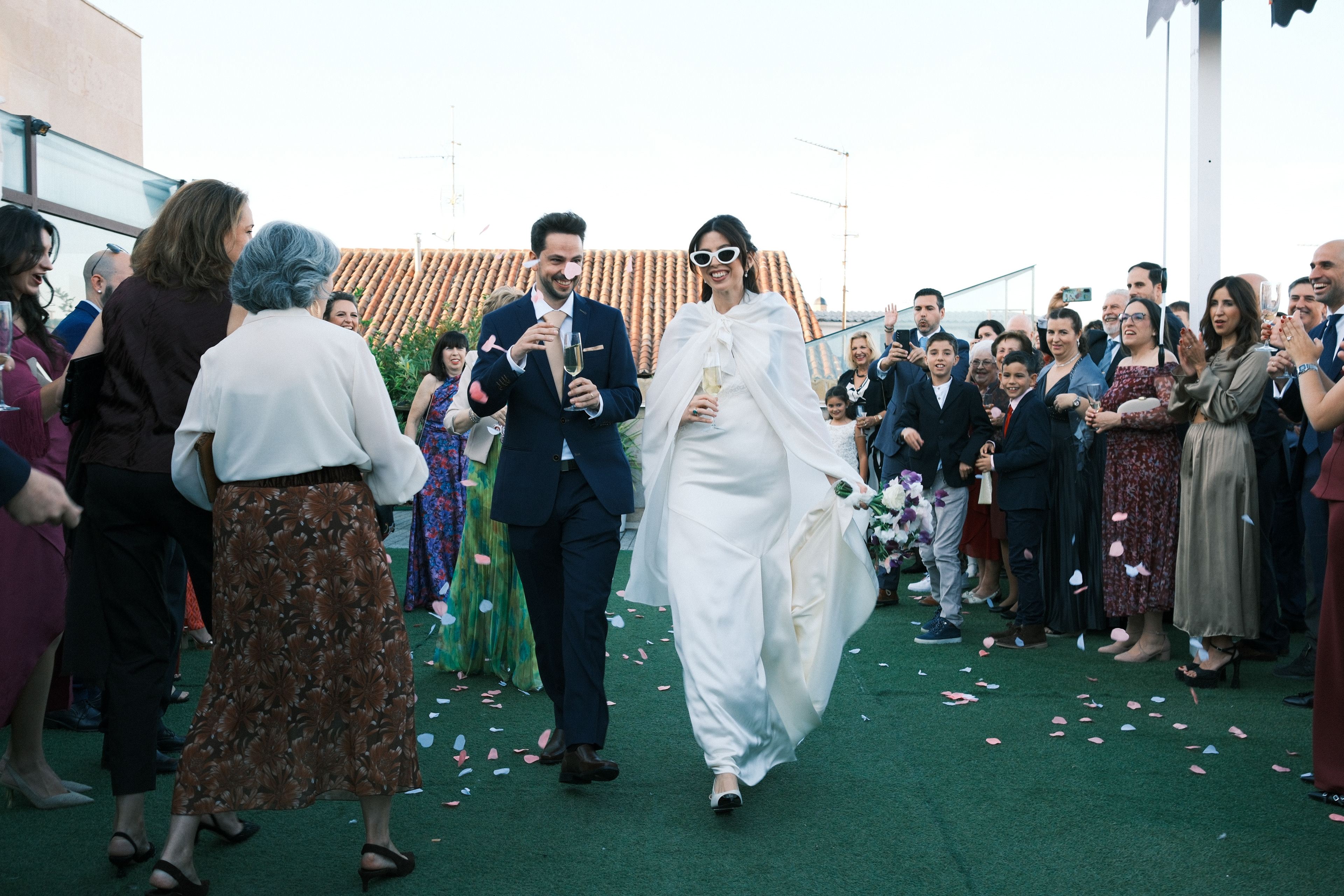 El segundo día sería todo un homenaje, empezamos la mañana con los preparativos de la pareja, Rubén en el piso junto a sus amigos y familia, Sil en el Hotel Casa y Fonda, maquillada infusión en mano por nuestra fav Cristina Hurlez. Alejandra Oria firmaba el vestido, adornado con dos lazos negros, Pretty Ballerinas calzaba de forma cómoda sin dejar de lado lo classy, y Flores Mercuriales por su lado nos traería el nuevo ramo de novia con tonos blancos, rosados y púrpuras. Paseamos juntos por la Plaza de Cervantes hasta La Terraza del Mercado entre halagos de locales y turistas, un ascensor nos llevaría hasta la cima, y entonces, lloverían los pétalos.