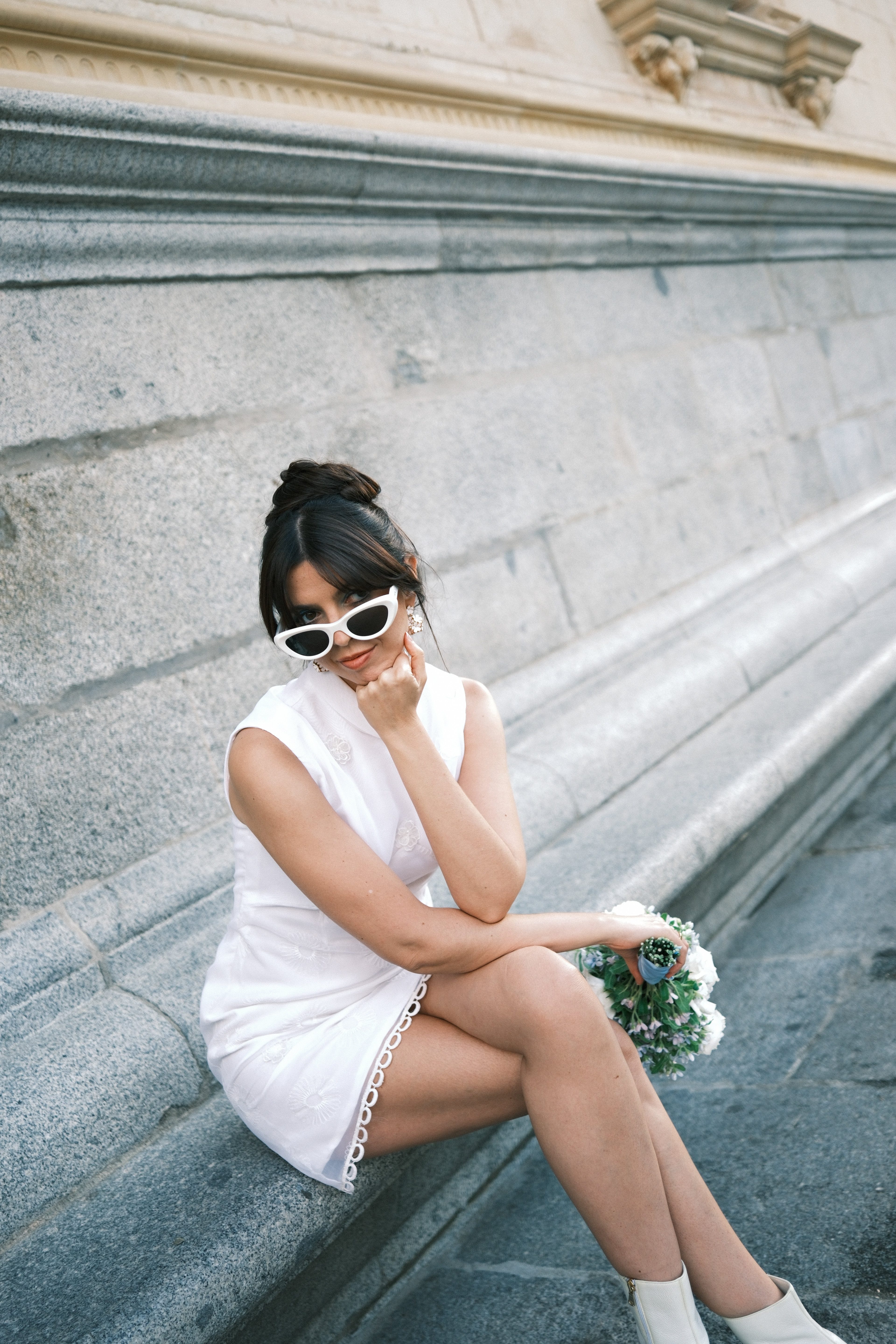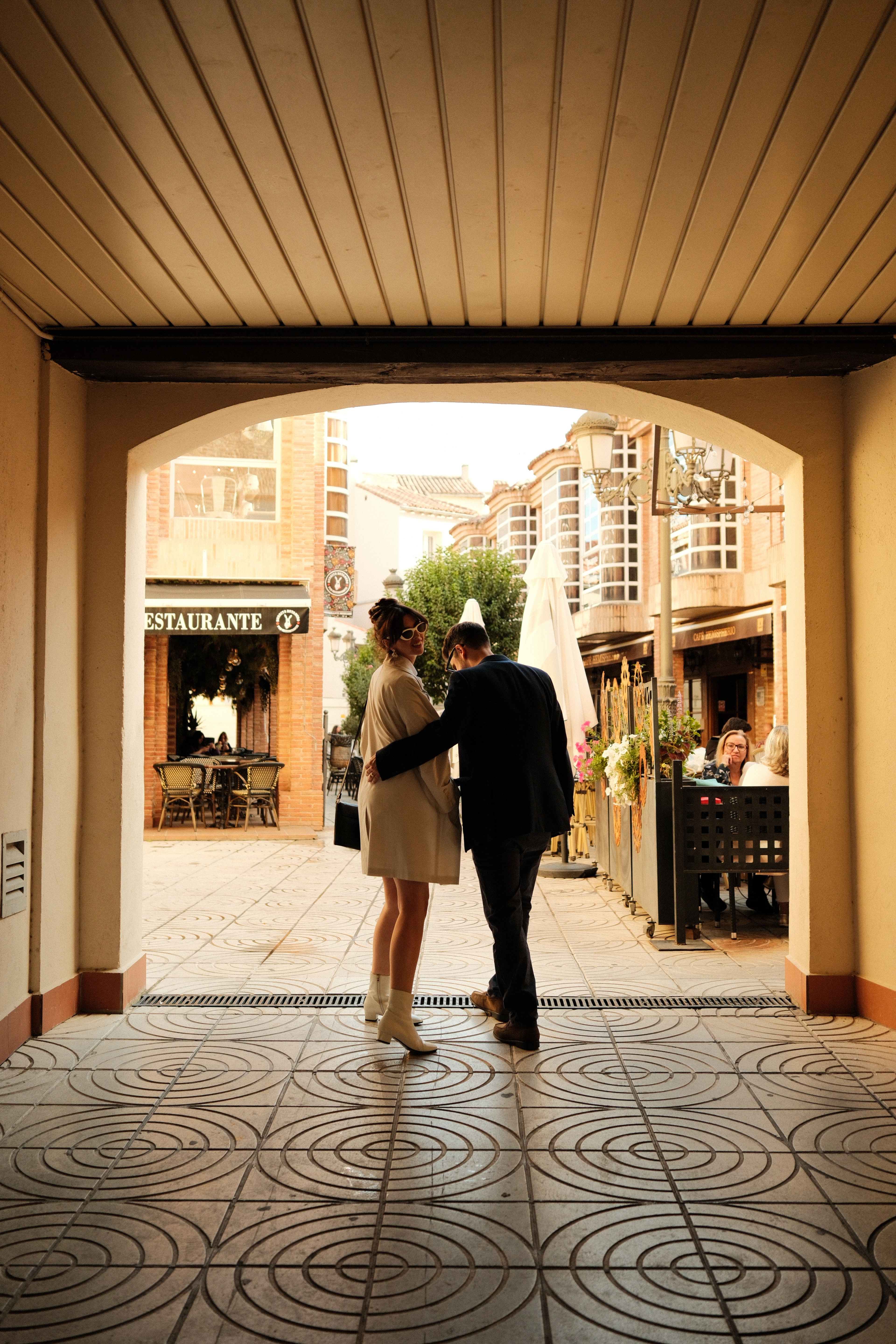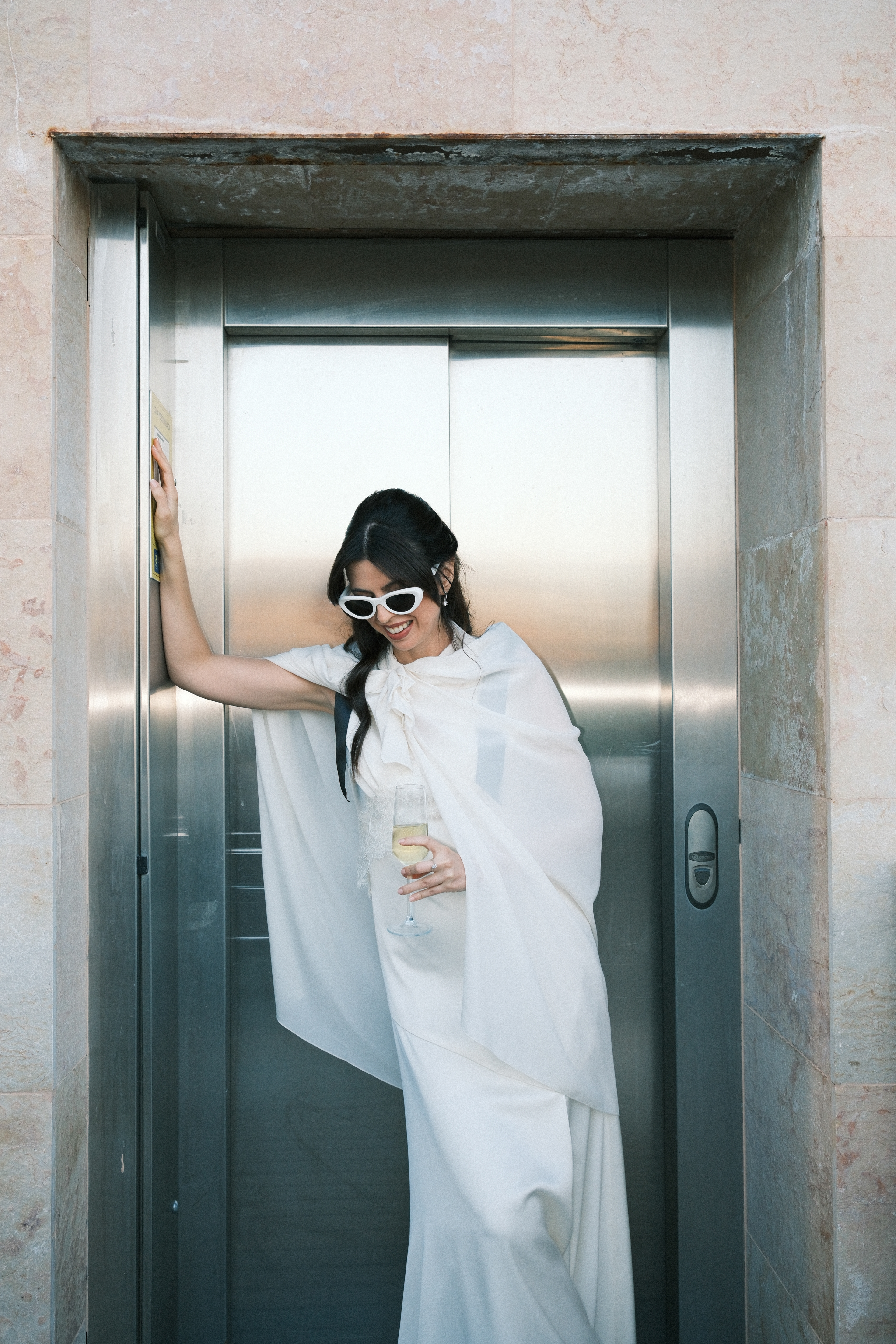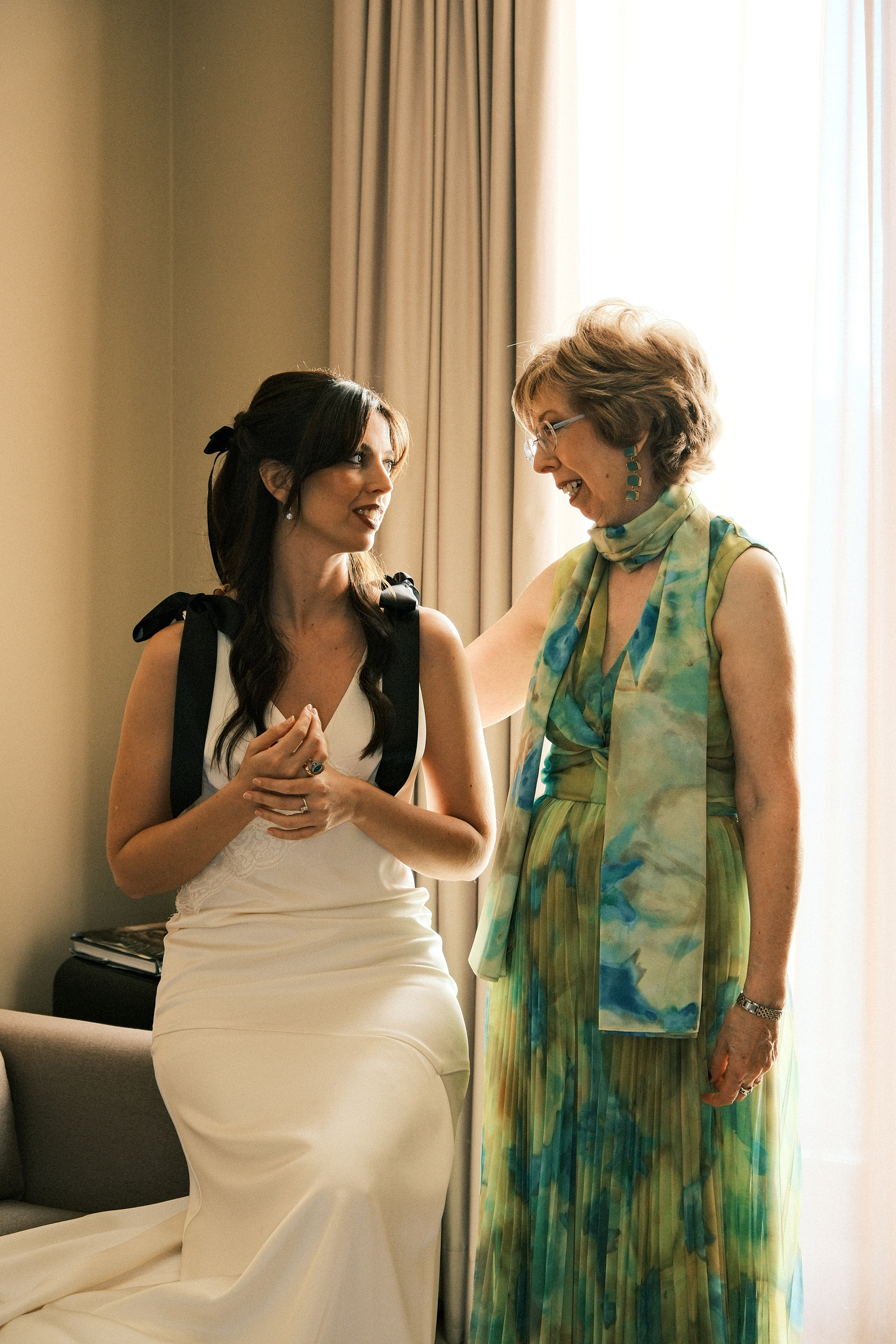 El segundo día sería todo un homenaje, empezamos la mañana con los preparativos de la pareja, Rubén en el piso junto a sus amigos y familia, Sil en el Hotel Casa y Fonda, maquillada infusión en mano por nuestra fav Cristina Hurlez. Alejandra Oria firmaba el vestido, adornado con dos lazos negros, Pretty Ballerinas calzaba de forma cómoda sin dejar de lado lo classy, y Flores Mercuriales por su lado nos traería el nuevo ramo de novia con tonos blancos, rosados y púrpuras. Paseamos juntos por la Plaza de Cervantes hasta La Terraza del Mercado entre halagos de locales y turistas, un ascensor nos llevaría hasta la cima, y entonces, lloverían los pétalos.