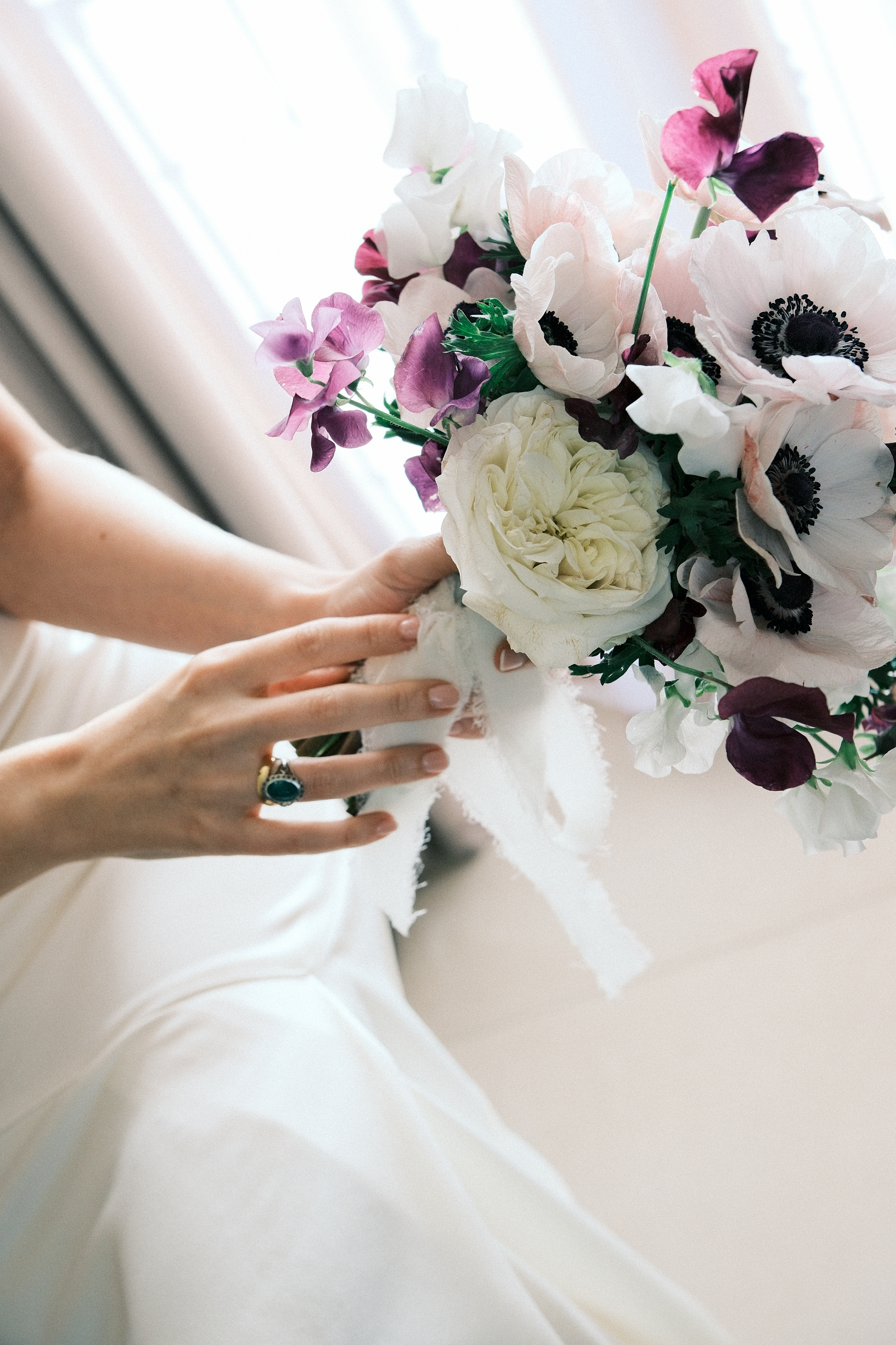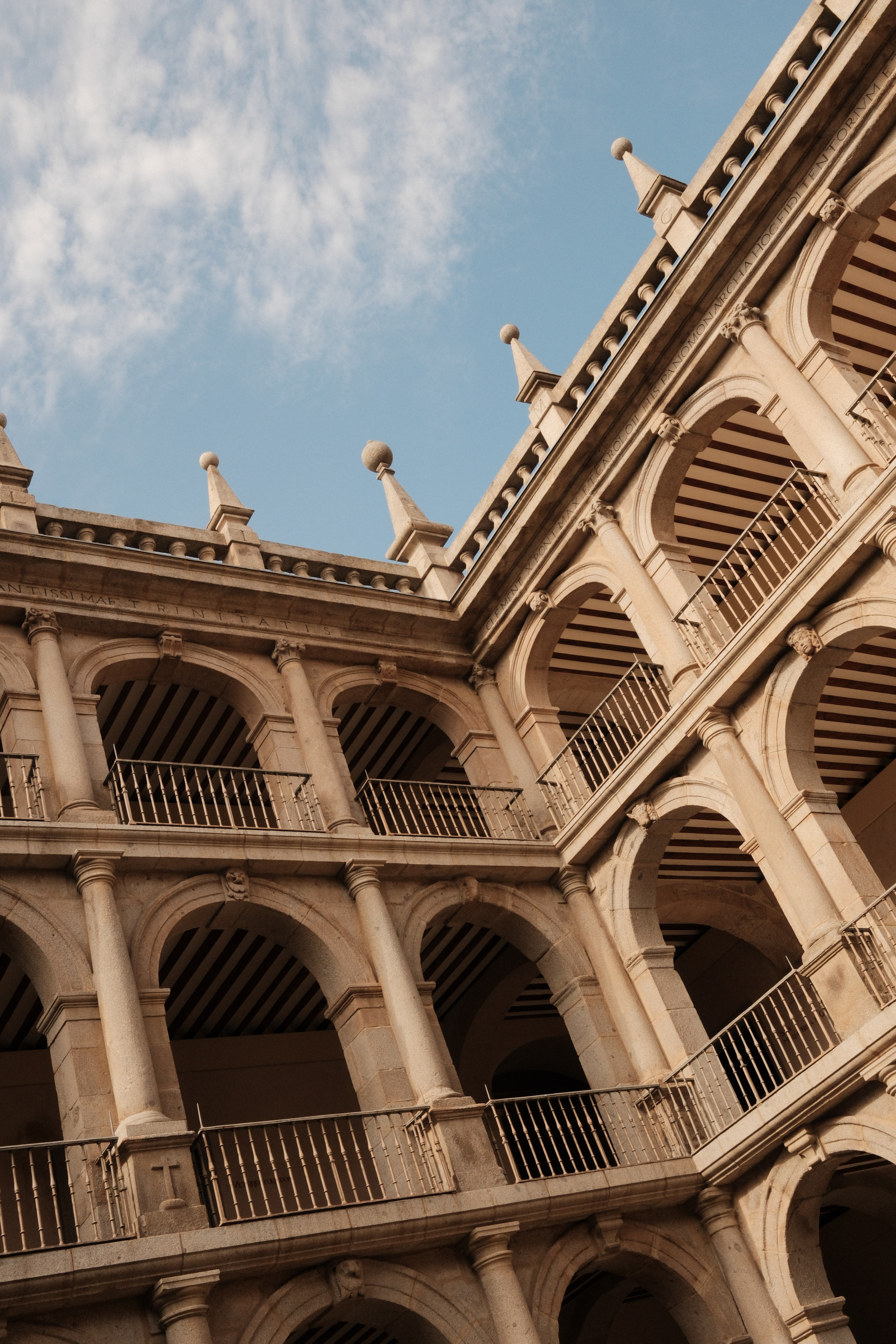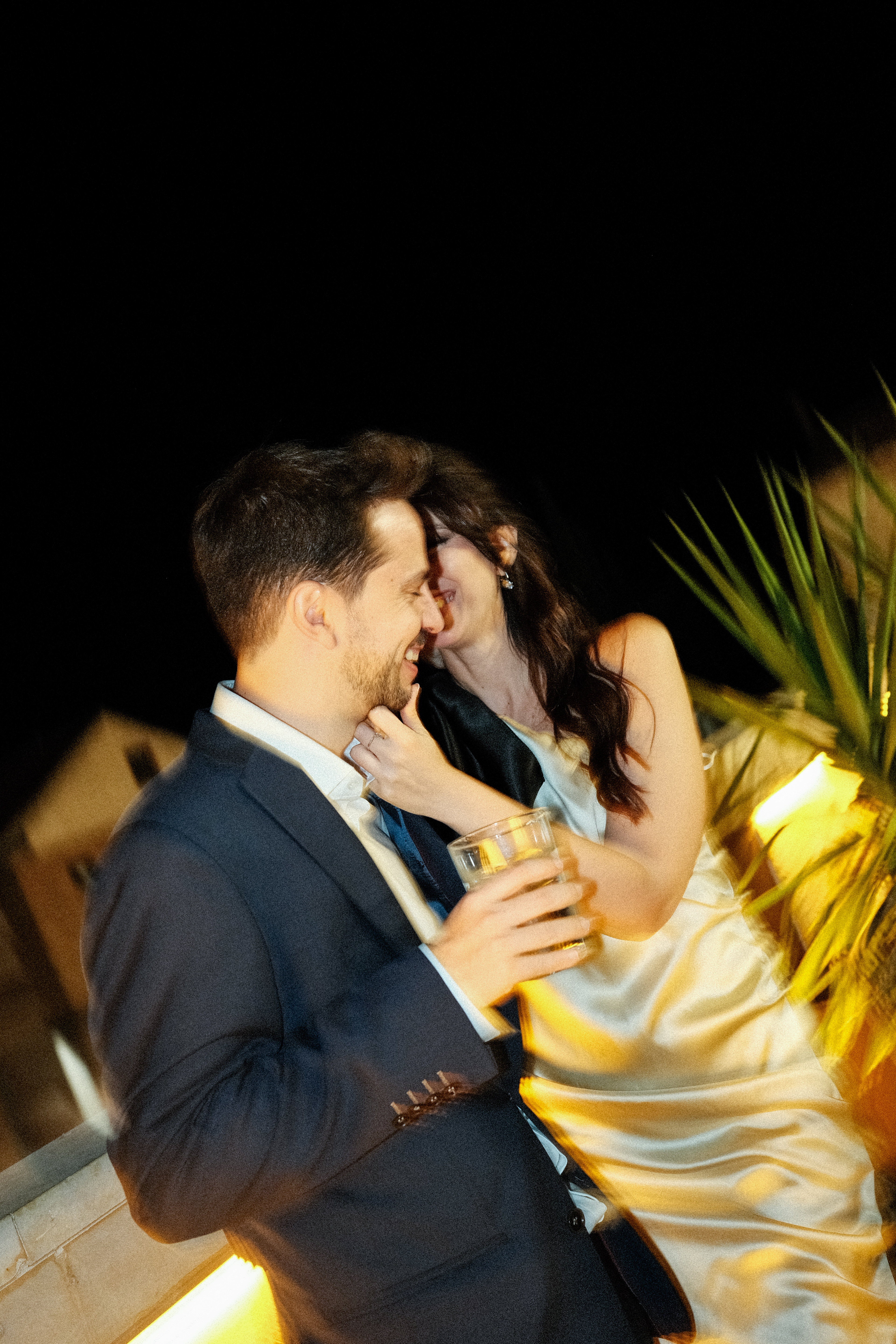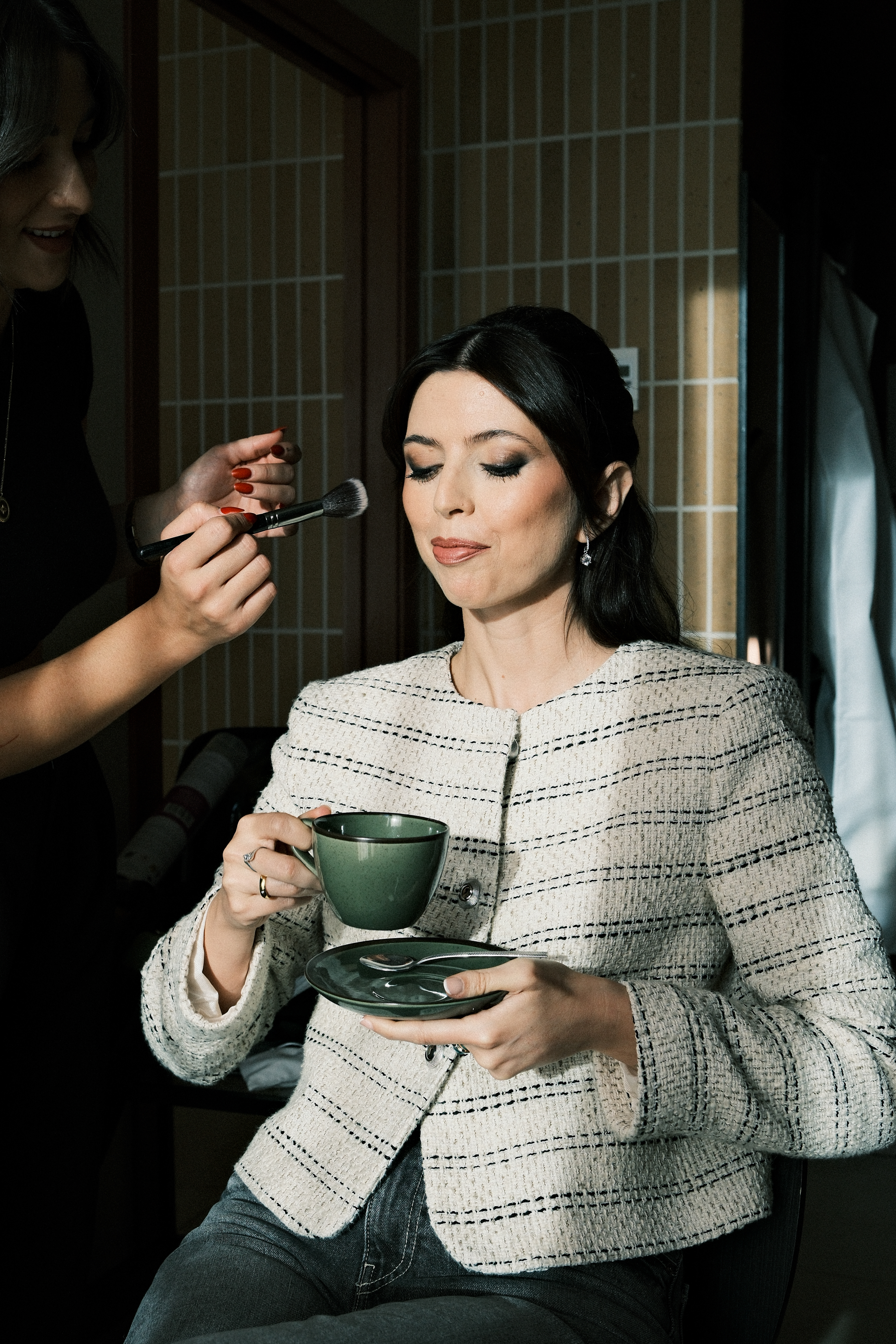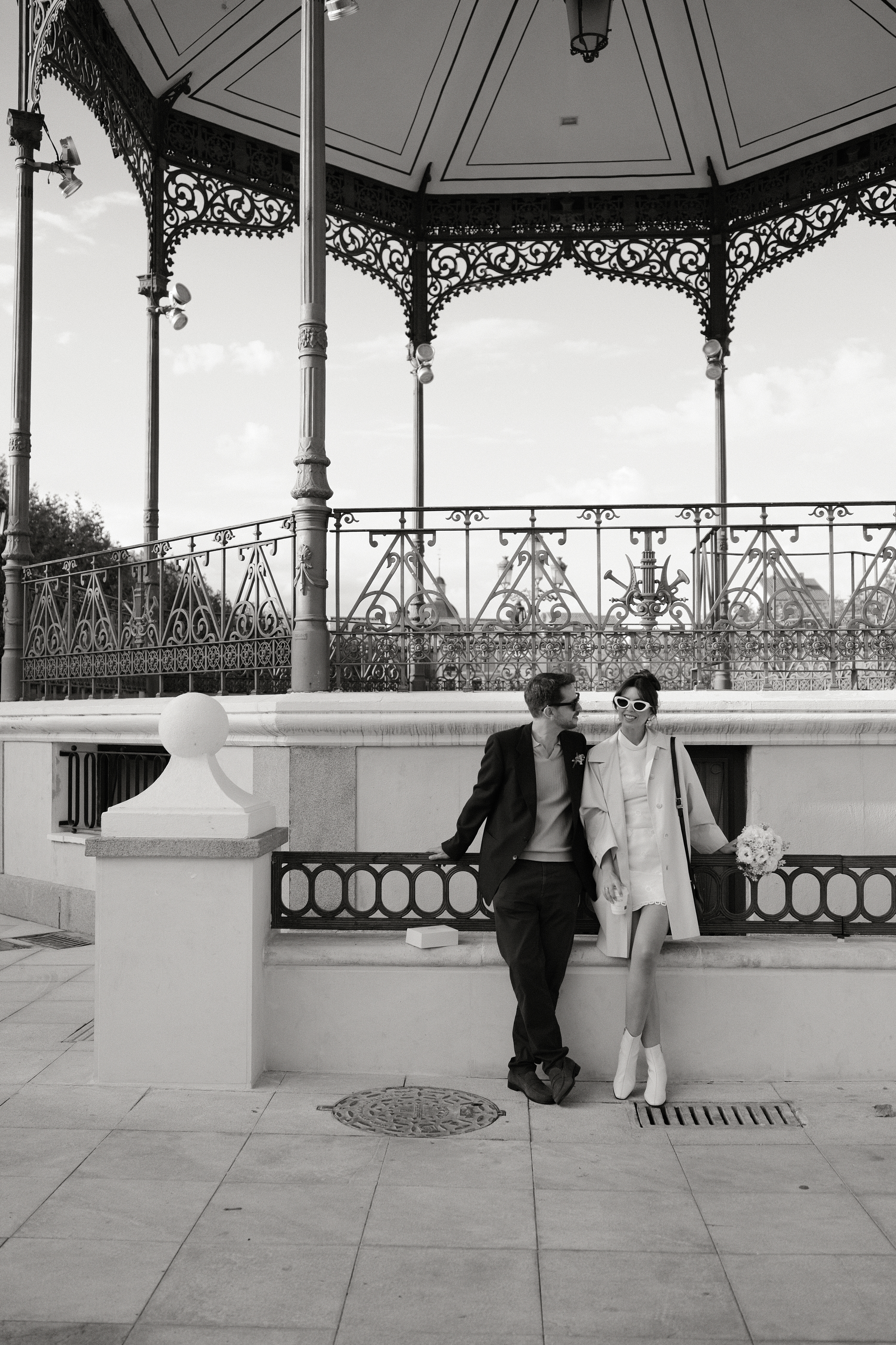 El segundo día sería todo un homenaje, empezamos la mañana con los preparativos de la pareja, Rubén en el piso junto a sus amigos y familia, Sil en el Hotel Casa y Fonda, maquillada infusión en mano por nuestra fav Cristina Hurlez. Alejandra Oria firmaba el vestido, adornado con dos lazos negros, Pretty Ballerinas calzaba de forma cómoda sin dejar de lado lo classy, y Flores Mercuriales por su lado nos traería el nuevo ramo de novia con tonos blancos, rosados y púrpuras. Paseamos juntos por la Plaza de Cervantes hasta La Terraza del Mercado entre halagos de locales y turistas, un ascensor nos llevaría hasta la cima, y entonces, lloverían los pétalos.