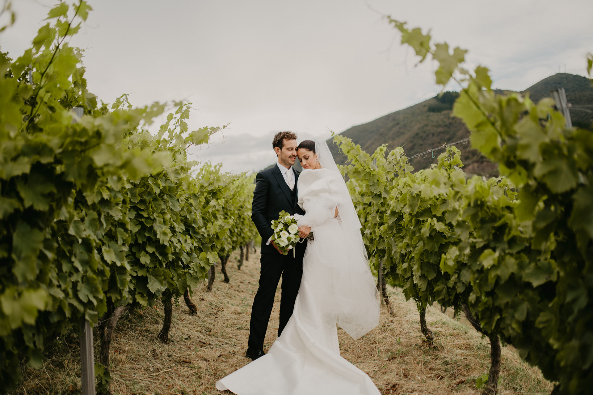 En el centro de Potes, en la Iglesia de San Vicente Mártir los invitados comenzaban a llegar. La iglesia ya estaba decorada por José Flores y Plantas, y el párroco aguardaba a la pareja. La ceremonia religiosa de María y Roberto sería de todo menos un manual encorsetado, en su lugar la música llenaría y haría inolvidable cada momento, y es que incluso hubo sorpresa a la guitarra y a la voz. Lágrimas y firmas, la pareja salió del templo entre una lluvia de pétalos y vítores. Era nuestro momento, la sesión de pareja. Caminamos dos minutos por el casco antiguo entre sus calles empedradas hasta uno de los puentes sobre el Río Deva que conformaba una auténtica postal. El velo del vestido de María ondeaba al viento. Seguimos inmortalizando a la pareja entre las zarzas de su viñedo familiar ya cerca de la finca particular Albanes, donde celebrarían entre vistas a la montaña el resto de su gran día.