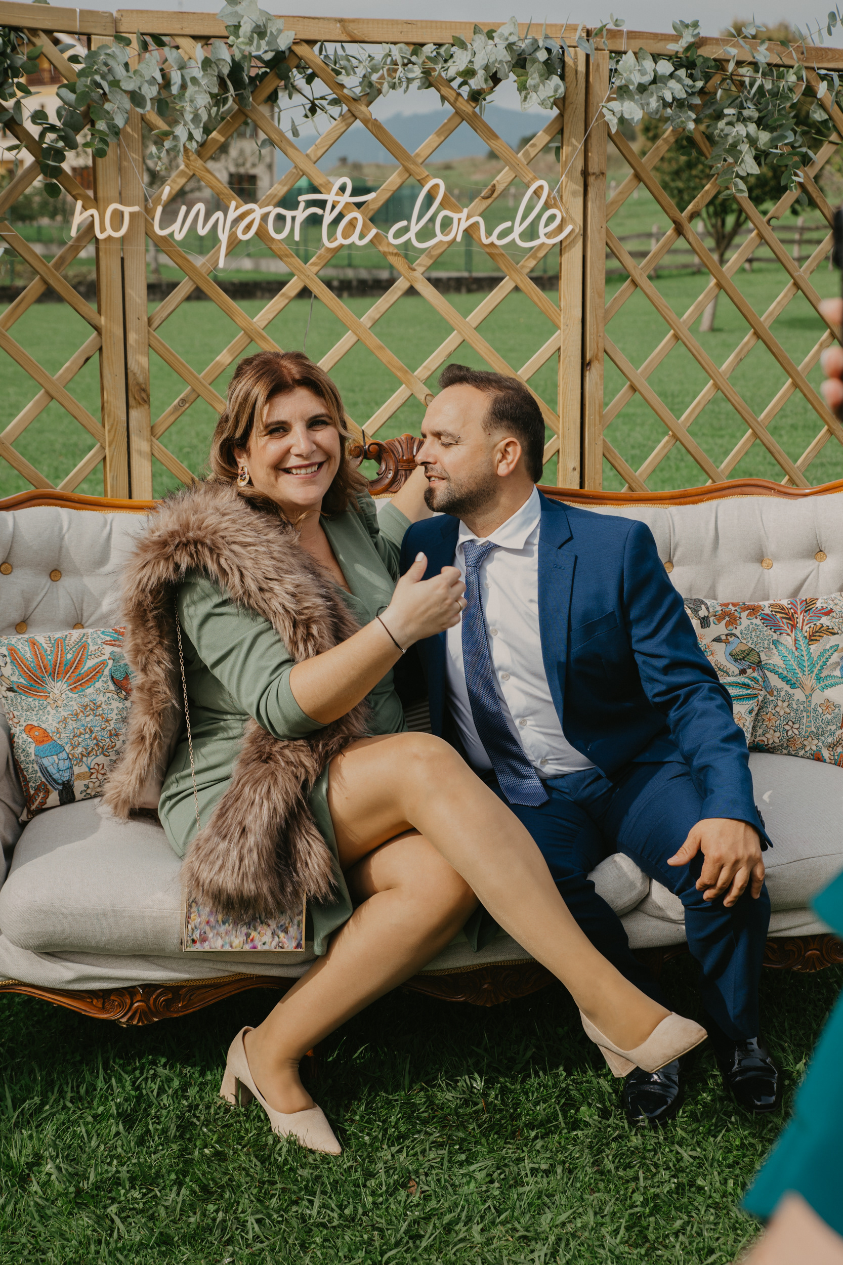 Ya con hambre y sed aparecimos en medio del cóctel. Desde este primer momento la calidad y oferta gastronómica del Restaurante Peña Mea empezó a brillar de la mano de diferentes puestos tipo foodtruck y un gran número de camareros con todo tipo de bebidas y tapas, desde lo más clásico de la cocina tradicional asturiana hasta la vanguardia contemporánea. Los invitados se repartían en el espacio aprovechando un banco ideal como photocall o su hórreo asturiano, el entorno del restaurante es verde y bonito. El cóctel fue amenizado con la música de Los Buscavidas que pondría a todo el mundo a bailar y saltar, incluso, animarían a todos a mantear a la pareja instantes antes de entrar al banquete.